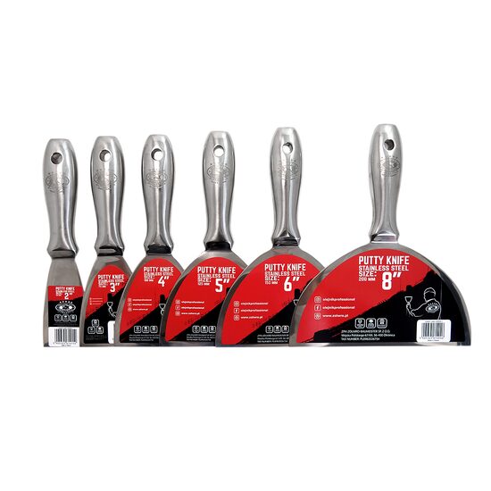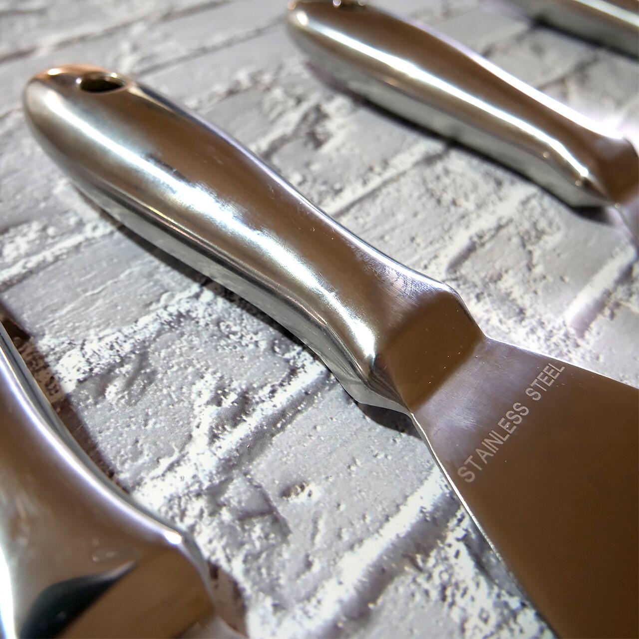 Set complet: Acest set cuprinde 6 spacluri din otel inoxidabil de inalta calitate, cu dimensiuni variate (2", 3", 4", 5", 6", 8" respectiv 50 mm, 75 mm, 100 mm, 125 mm, 150 mm si 200 mm), oferind flexibilitate pentru o gama larga de aplicatii.
