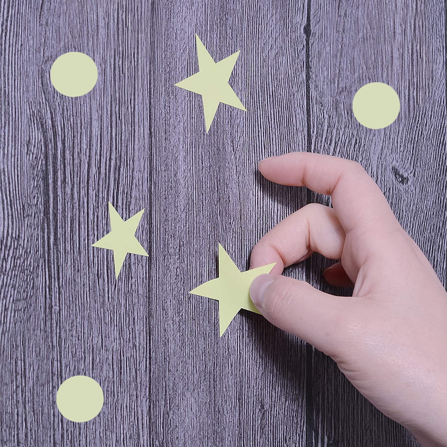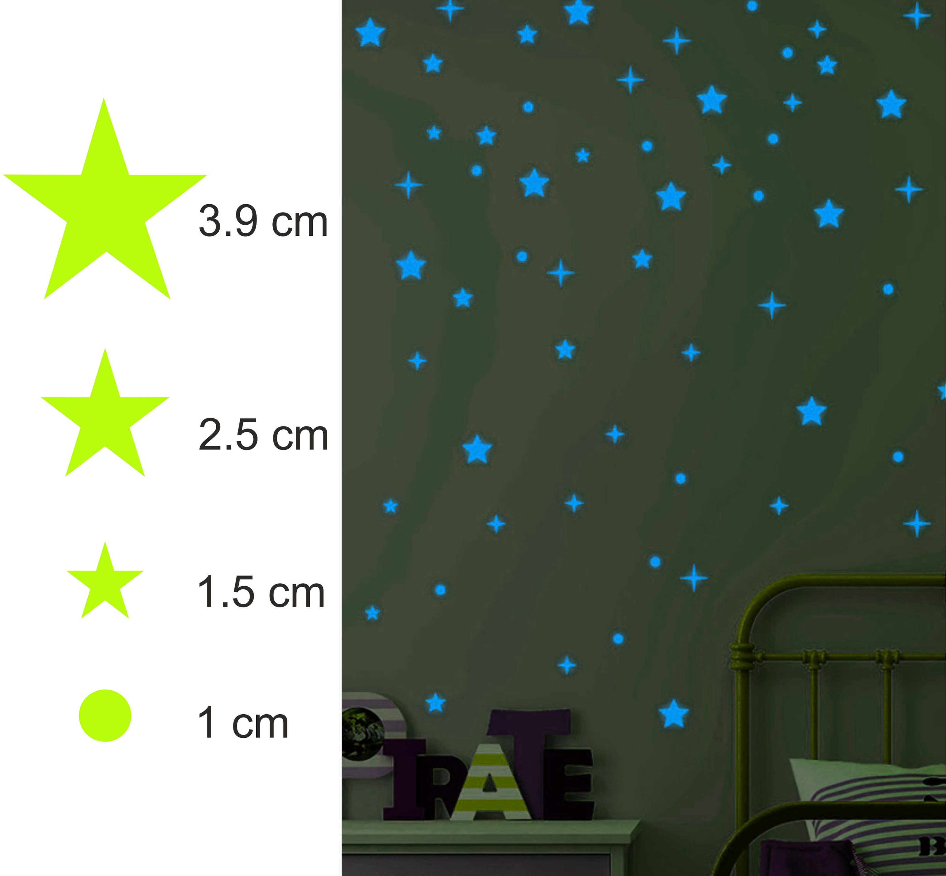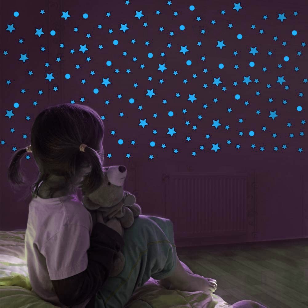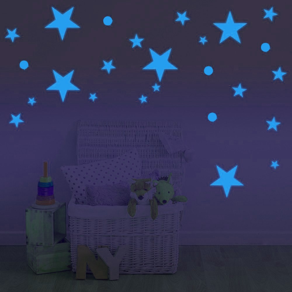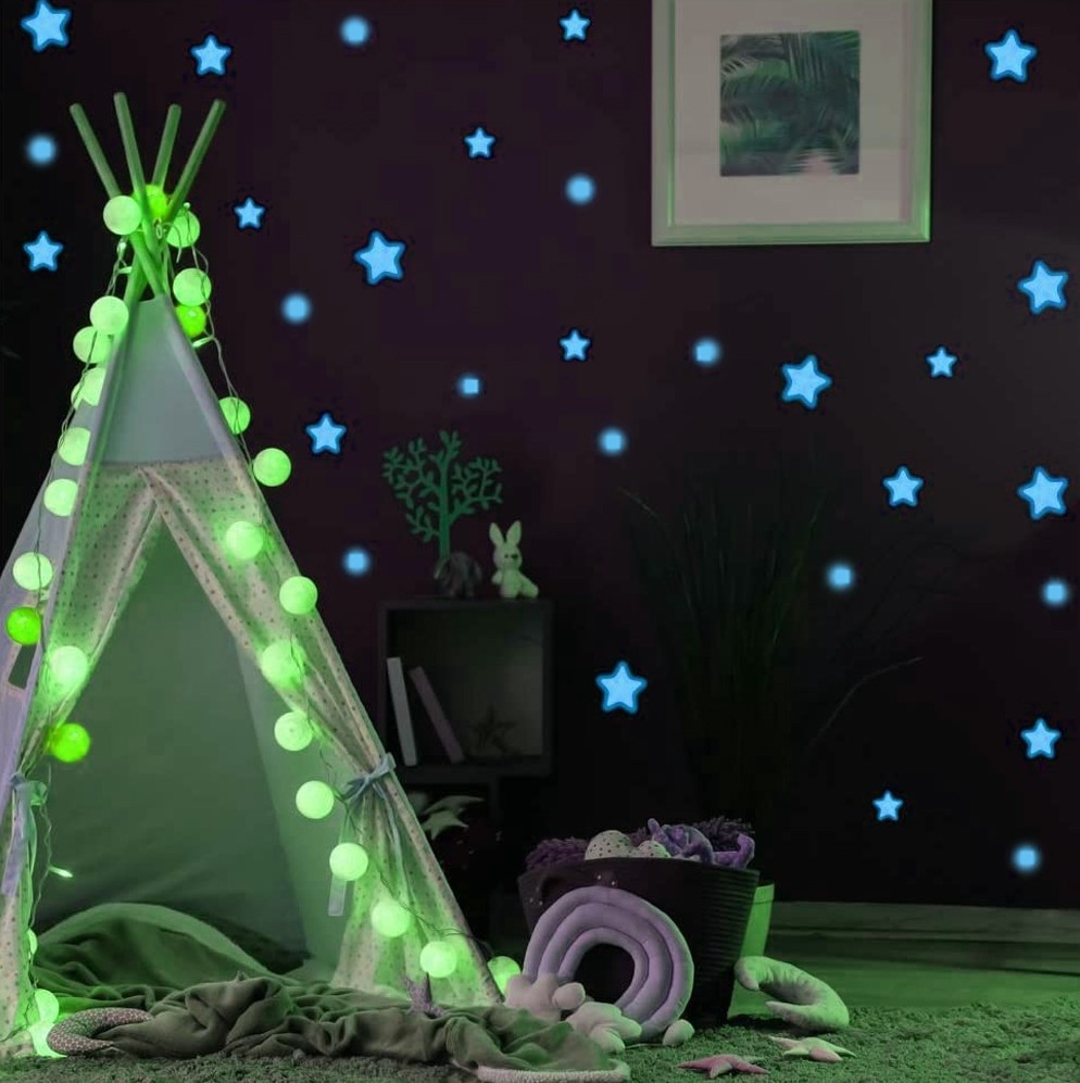 Transforma camera copilului intr-un mic univers cu acest set de stickere fosforescente in forme de stelute si buline. Se incarca la lumina si stralucesc albastru intens in intuneric, pentru un ambient relaxant la somn sau povesti de seara.