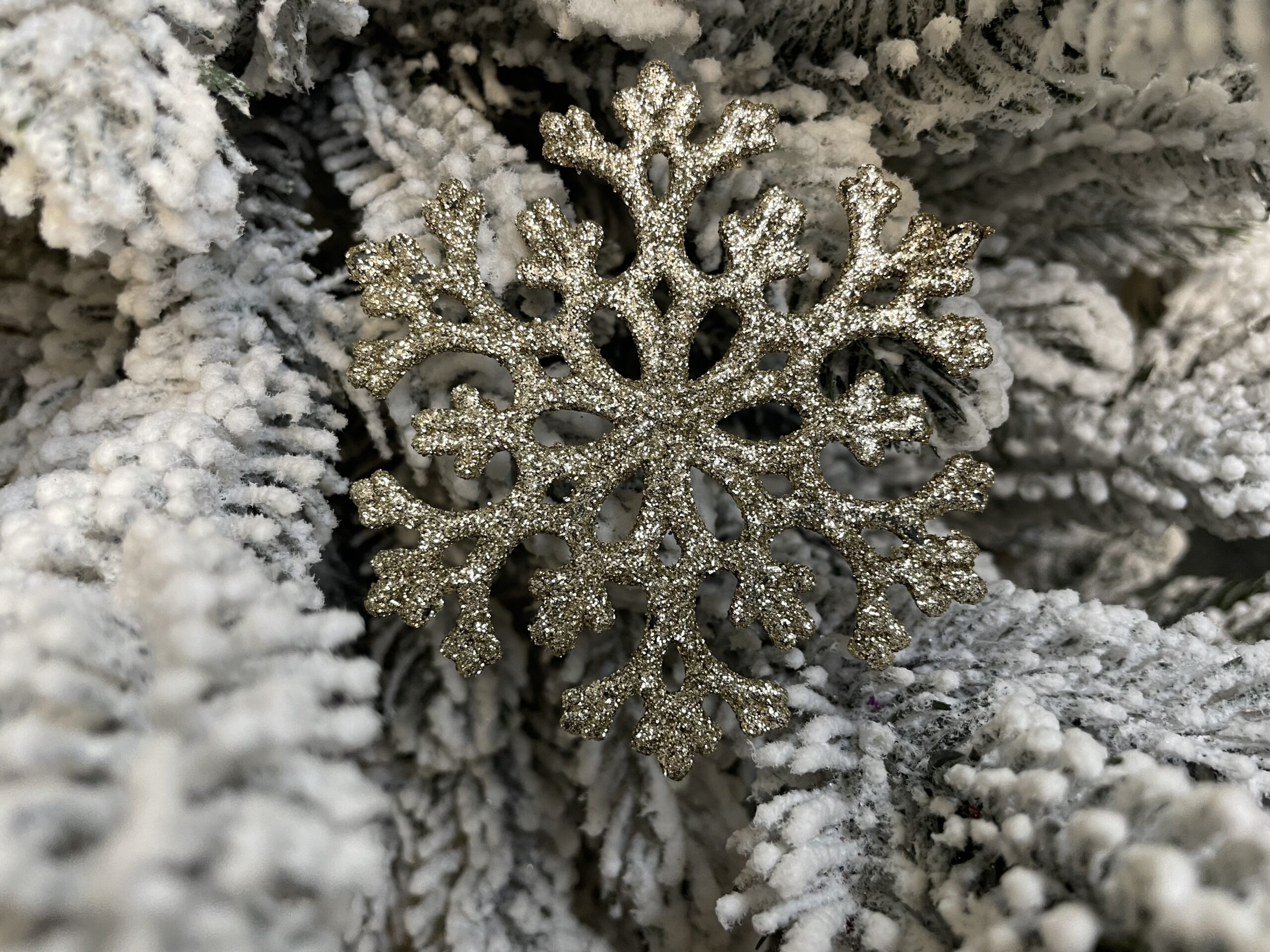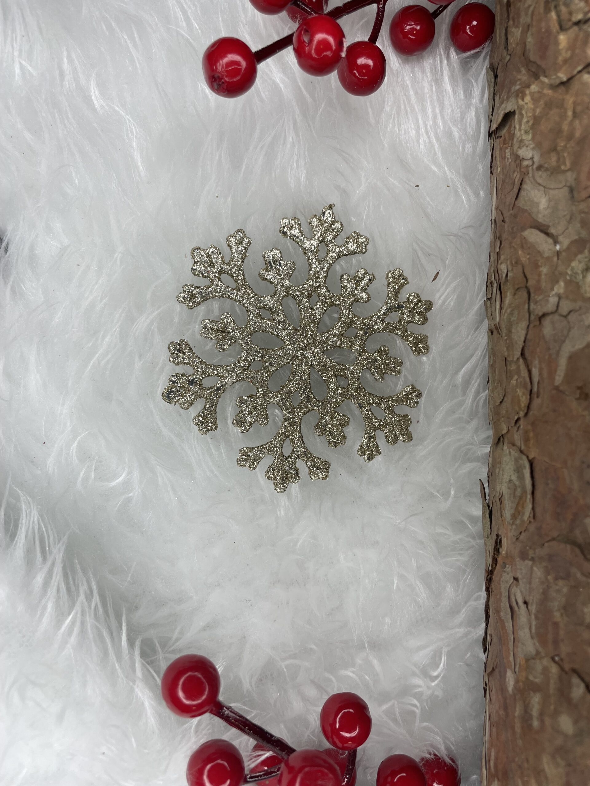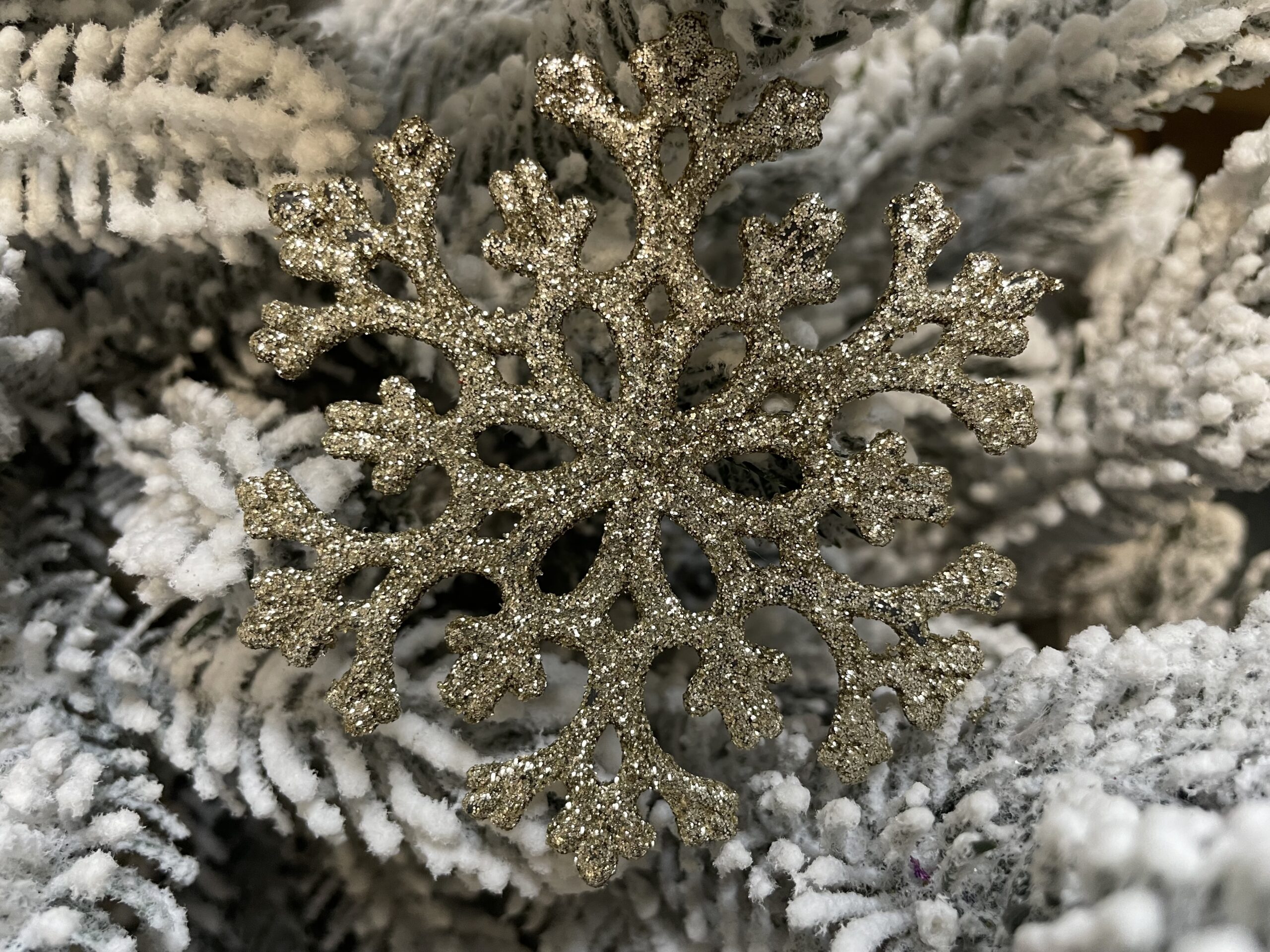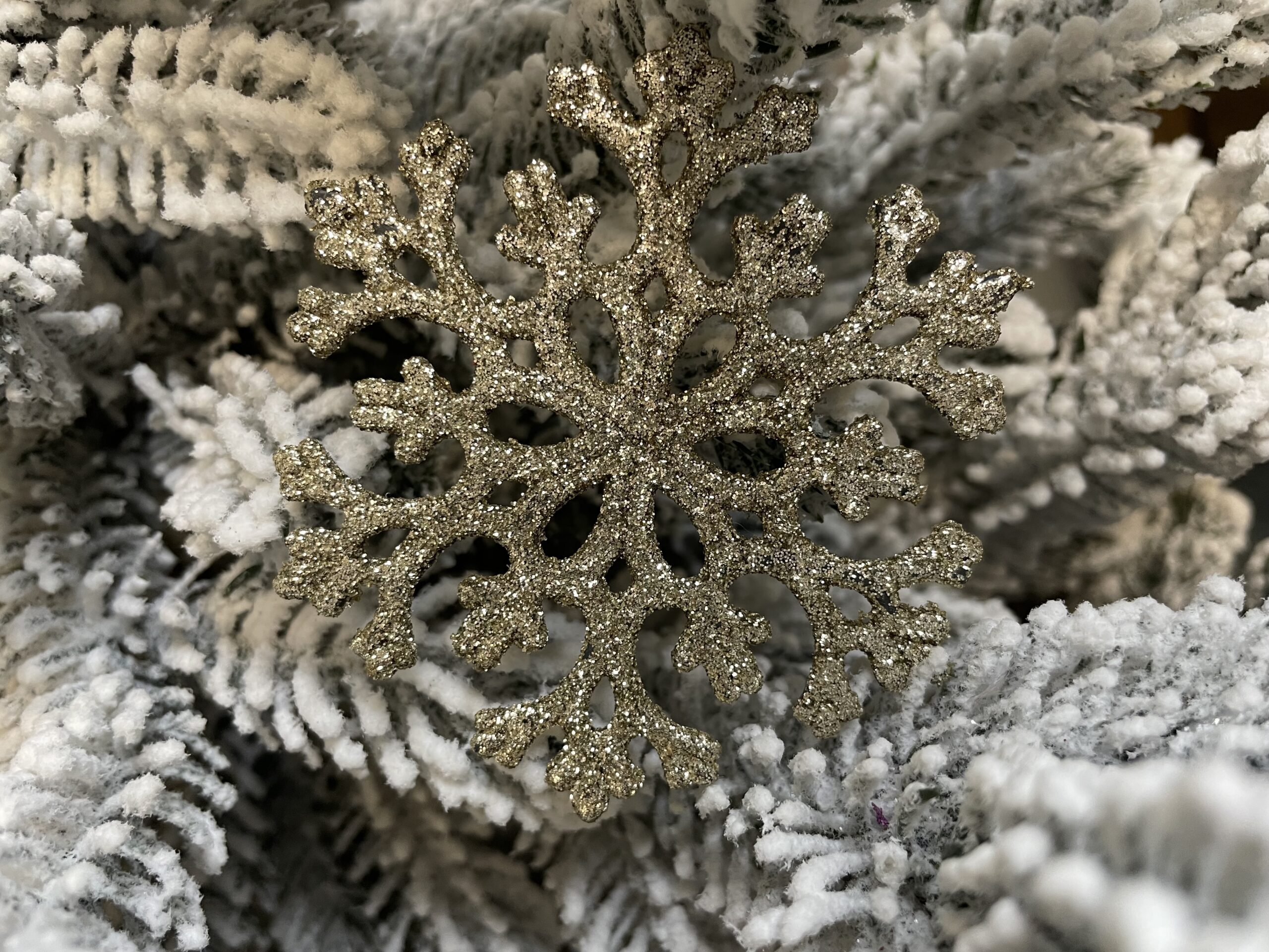 Adauga un plus de farmec sarbatorilor cu acest set de decoratiuni pentru brad in forma de fulgi de zapada aurii. Cu un design elegant, decupaje decorative si finisaj stralucitor cu sclipici, aceste ornamente sunt ideale pentru a completa un brad de Craciun festiv si rafinat. Realizate din plastic, sunt usoare, rezistente si potrivite pentru locuintele in care sunt copii sau animale de companie.
