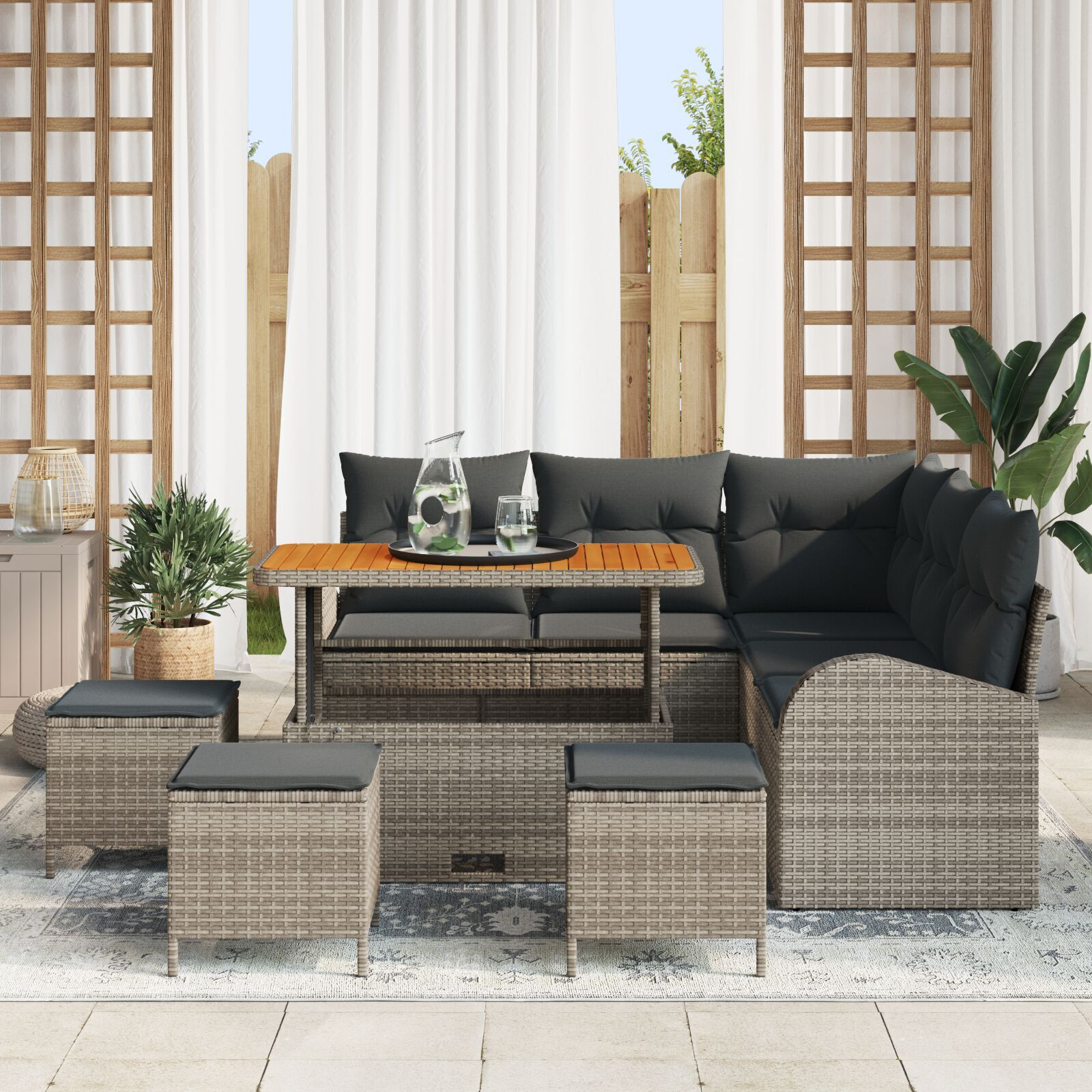 Set 8 Piese Canapea Grădină cu Pernă Gri Ratan Polimeric Acacia, Canapea Grădină cu 2 Locuri Gri Ratan Polimeric, Set Dining Grădină 3 Piese cu Pernă Gri Ratan Polimeric Acacia GartenMobel Dekor