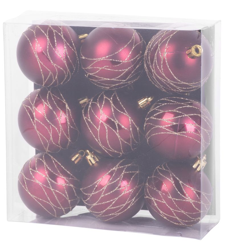 Set 9 globuri pentru brad de Craciun bordo mate cu decor, 6 cm