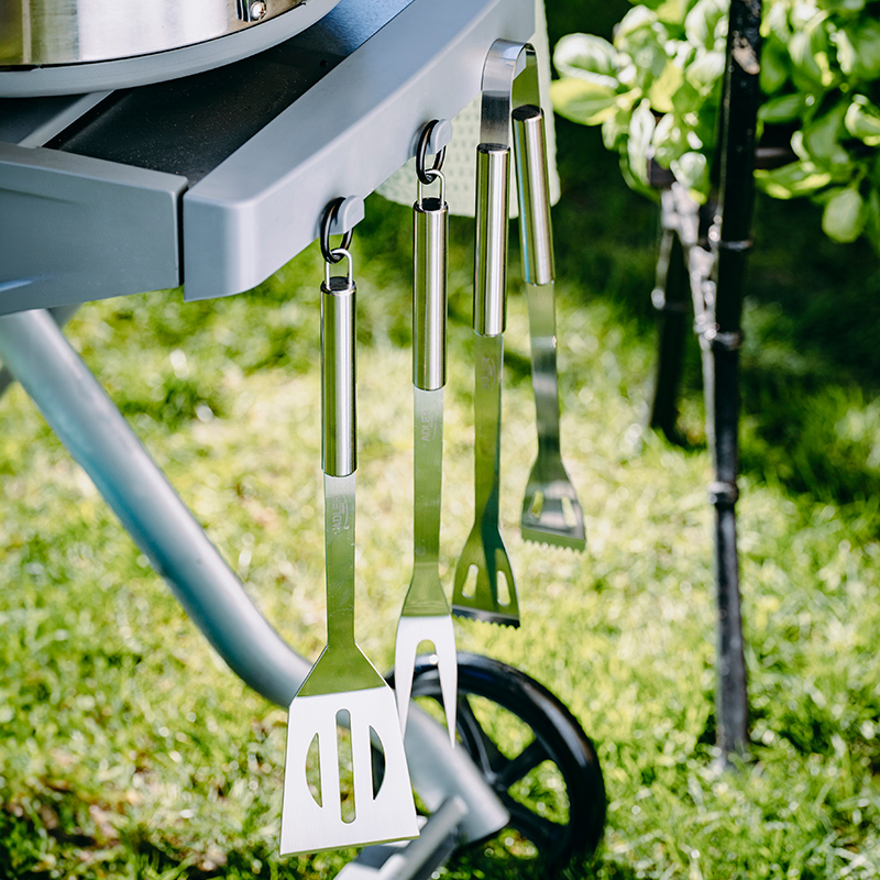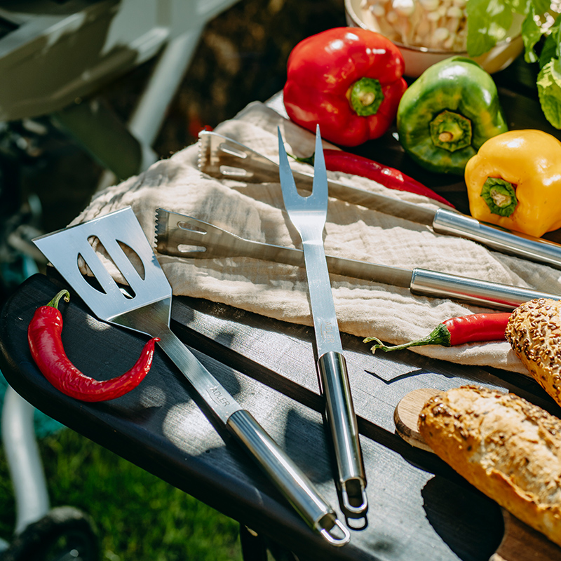 Setul include: o spatulă cu margine ascuțită (35,4 x 7,7 cm) pentru intoarcerea și servirea cu ușurință a alimentelor gatite, o furculiță (35,3x3,4 cm) perfectă pentru a ține carnea în timp ce tăiați și clești cu 8 dinți (34,5 x 4,2 cm).