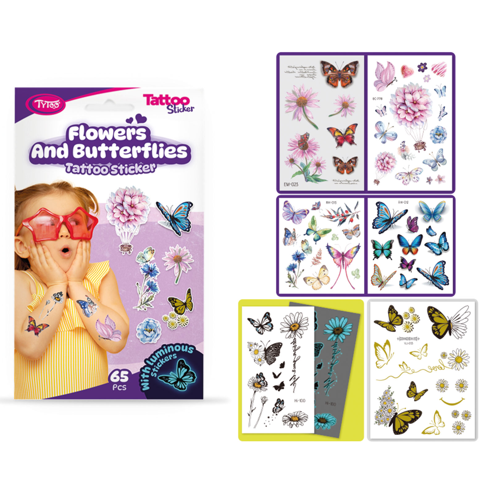 Usor de aplicat, tatuaje simple si spectaculoase pentru iubitorii de flori si fluturi. Aceste autocolante cu tatuaje temporare sunt de înaltă calitate, astfel încât își păstrează culoarea și detaliile vii pentru o lungă perioadă de timp, chiar și zile. Sunt ușor de aplicat și îndepărtat fără a irita sau deteriora pielea. Conținutul setului: 65 de tatuaje cu autocolante de flori și fluturi pe 6 foi, o mulțime de fluturi, flori, strălucitoare și colorate și chiar și un balon cu flori.