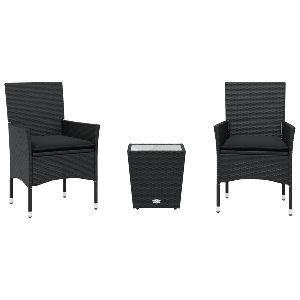 Set bistro cu perne, 3 piese, negru, poliratan și sticlă GartenMobel Dekor