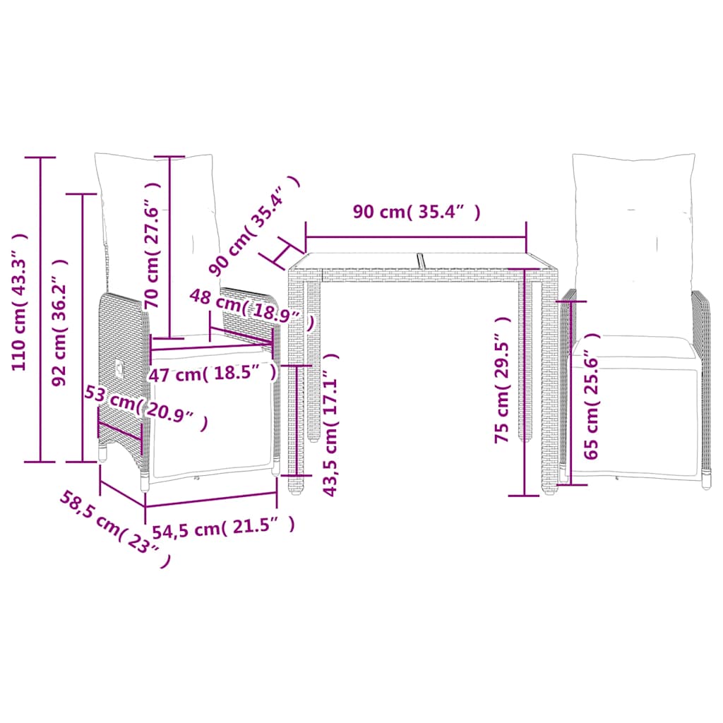 Set bistro de grădină cu perne, 3 piese, negru, poliratan GartenMobel Dekor