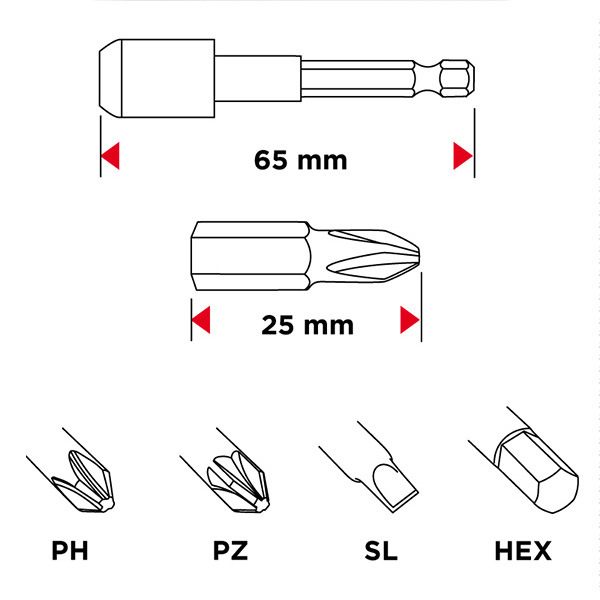 - Biti lungime 25 mm: PH1, PH2x2, PH3, PZ1, PZ2x2, WP3, SL3, SL4, SL5, SL6, H3, H4, H5, H6, TX10, TX15, TX20, TX25, TX27, TX30 , TX40, TT10, TT15, TT20, TT25, TT27, TT30, TT40
