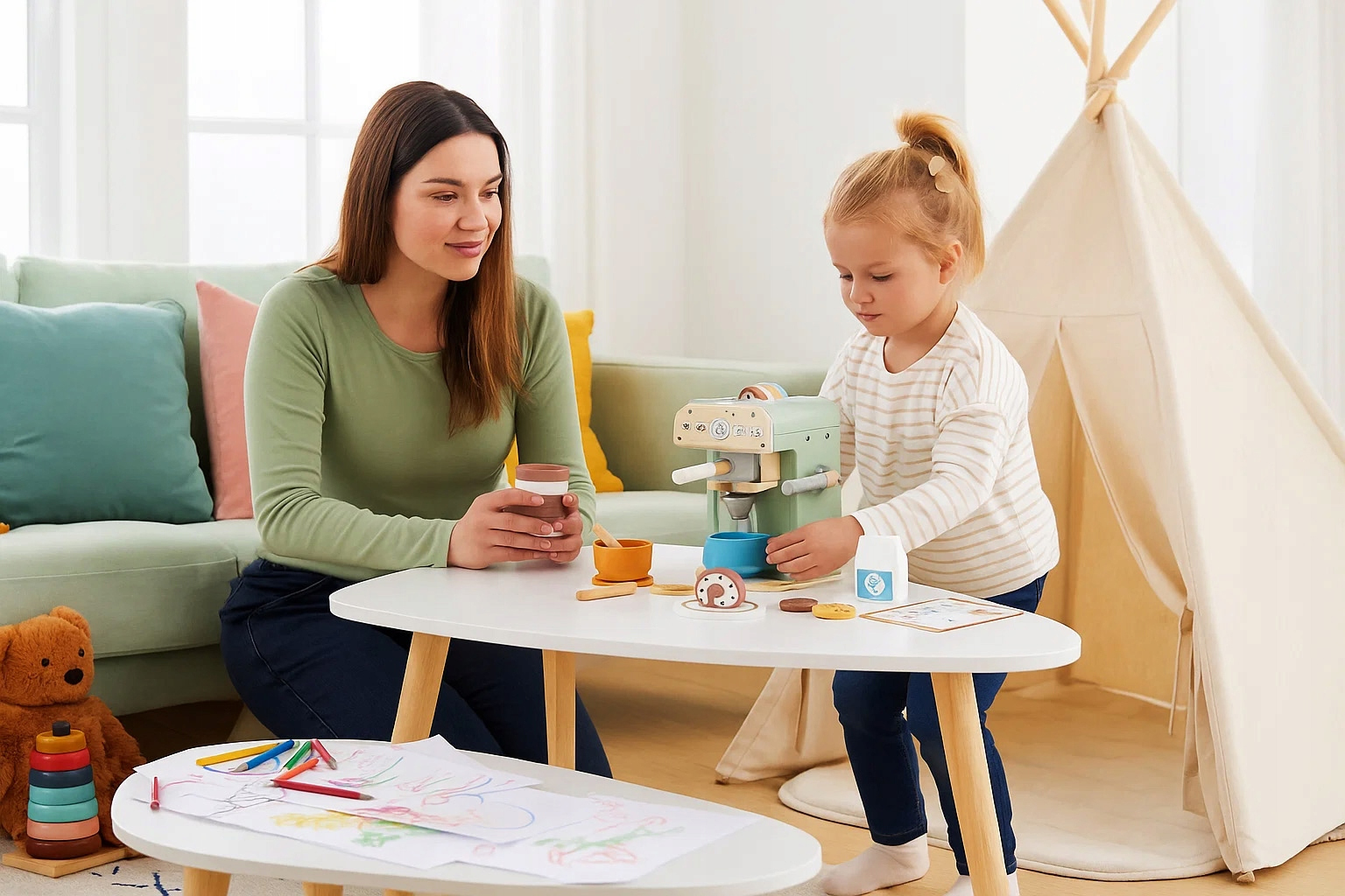 Mod de utilizare: copilul poate folosi aparatul de cafea si accesoriile pentru a recrea scene din viata de zi cu zi, servind bauturi si gustari intr-o mini cafenea. Este o alegere excelenta pentru activitati educative si distractive.