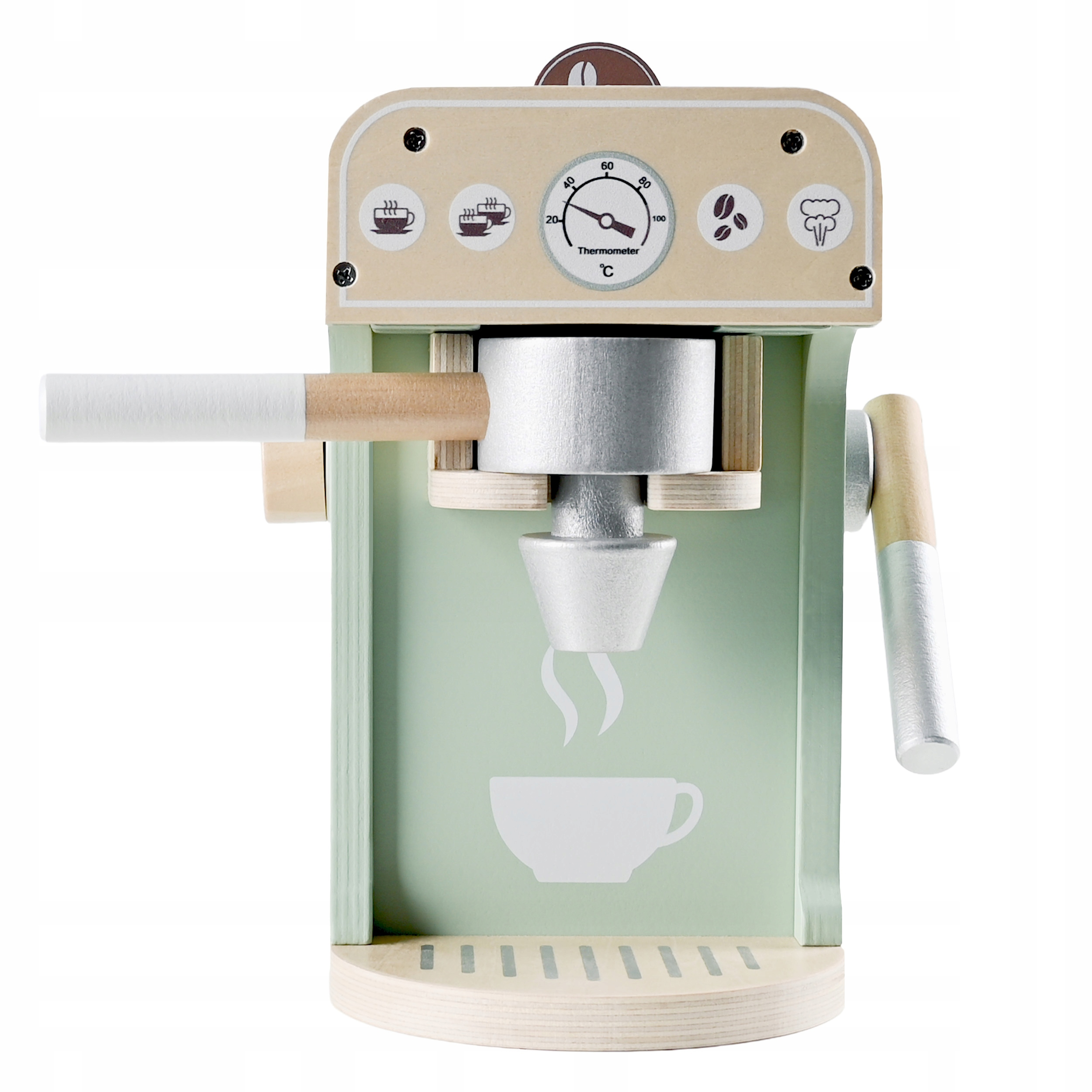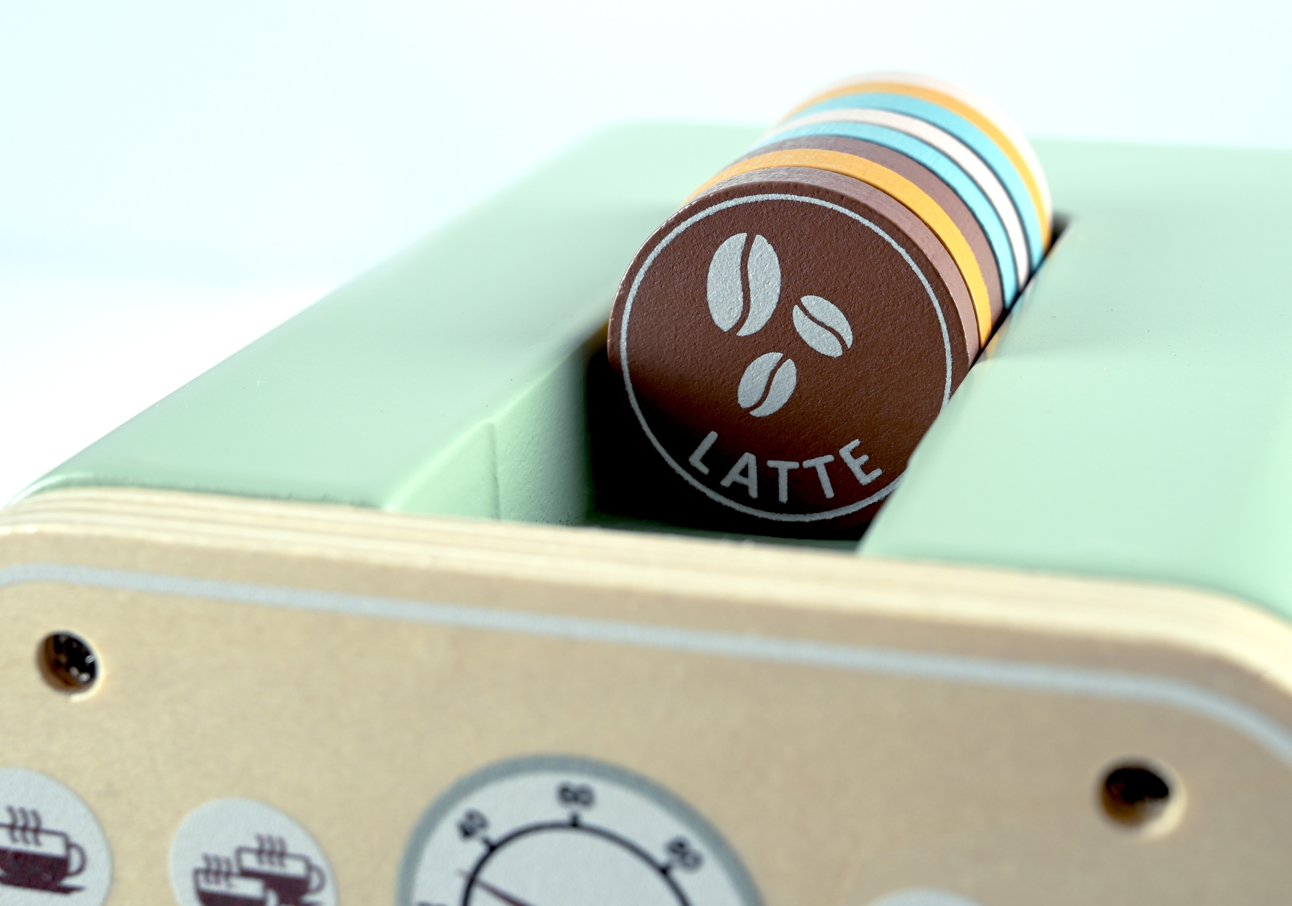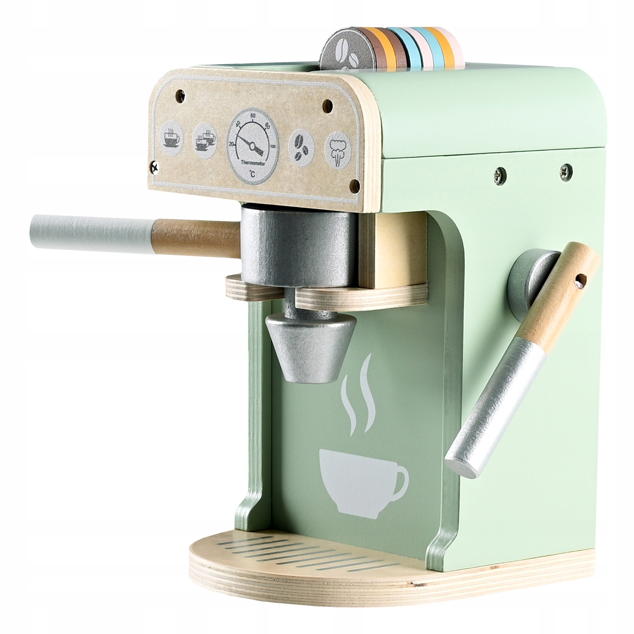 Setul include un espressor de jucarie din lemn si accesorii inspirate dintr-o cafenea adevarata, fiind potrivit pentru joaca individuala sau impreuna cu alti copii. Designul multicolor si piesele bine conturate il fac usor de folosit acasa, in camera copilului sau la gradinita.