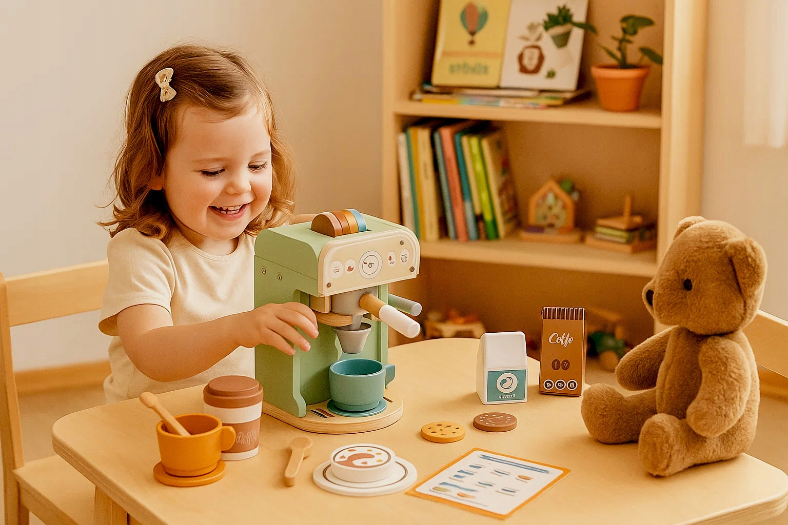 Transforma joaca de zi cu zi intr-o experienta plina de imaginatie cu acest set cafenea din lemn pentru copii, realizat in stil realist si vesel. Micii barista pot pregati cafele delicioase, pot servi clientii si pot inventa propriul meniu, dezvoltandu-si creativitatea, coordonarea si abilitatile sociale prin joc de rol.