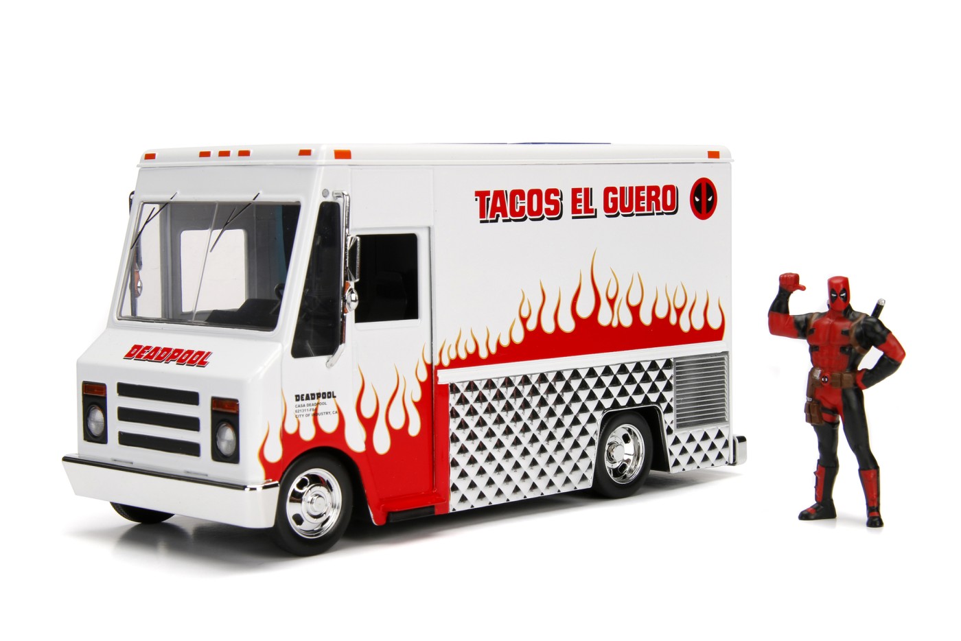 Adaugă în colecția ta un set Deadpool spectaculos, inspirat din universul Marvel. Acest camion food truck Deadpool la scara 1:24 impresionează prin designul original, finisajele atent realizate și elementele mobile care îi oferă un aspect autentic. Setul include și o figurină metalică Deadpool, perfectă pentru expunere alături de vehicul.