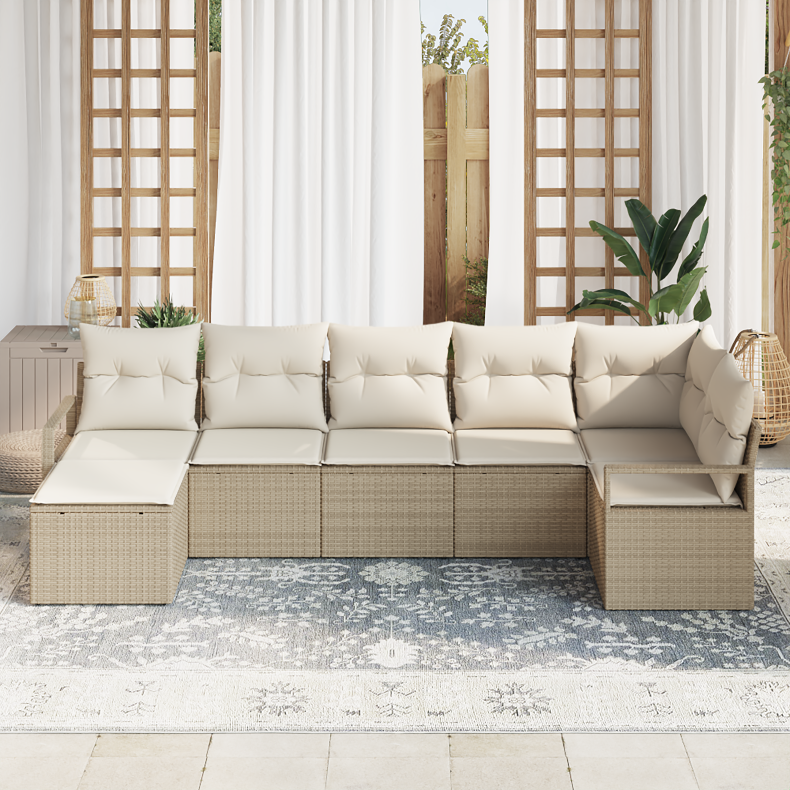 Set Canapea 7 Piese cu Perne Bej Ratan Poliester, Canapea pentru 2 Persoane cu Stocare & Perne Bej Ratan Poliester GartenMobel Dekor