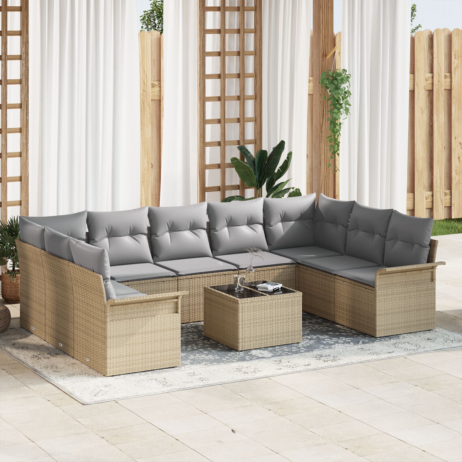 Acest set elegant de canapea pentru exterior îmbină stilul cu funcționalitatea, perfect pentru relaxare pe terasă sau în grădină. Cu tonurile classy de bej și gri deschis, îmbunătățește orice loc de afară și oferă multe locuri confortabile pentru a socializa.