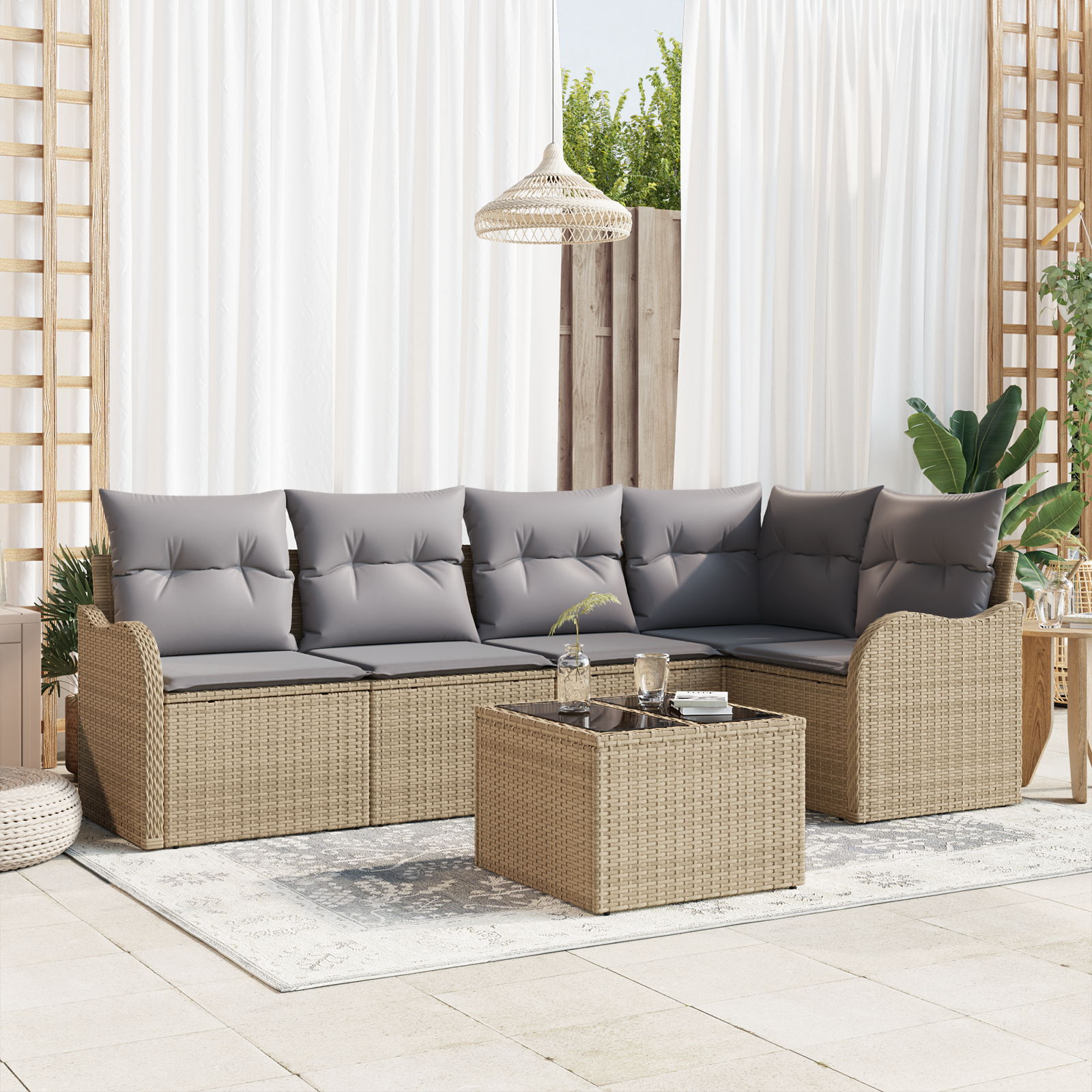 Setul de canapele secționale exterioare e despre stil și utilitate, perfect pentru oricine vrea să îmbunătățească spațiile exterioare. Cu culorile atrăgătoare bej și gri și ratanul tăiat manual, e un adevărat atrăgător pentru terase, balcoane sau grădini, pregătind terenul pentru distracție și relaxare.