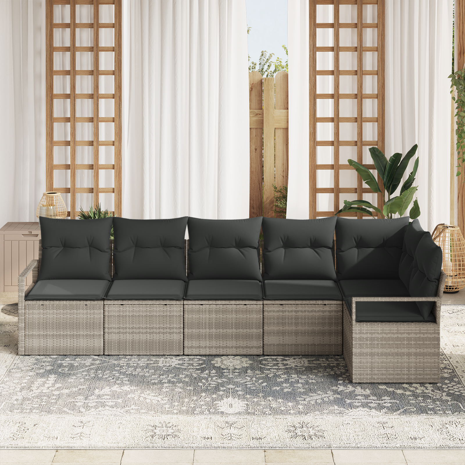 Întâlnește setul modular de canapea de grădină vidaXL 6 piese, aliatul tău pentru o viață exterioară modernă. Făcut din ratan poli gri deschis cu texturi trendy, acest set spațios transformă orice terasă, balcon sau grădină într-o escapadă chic și confortabilă.