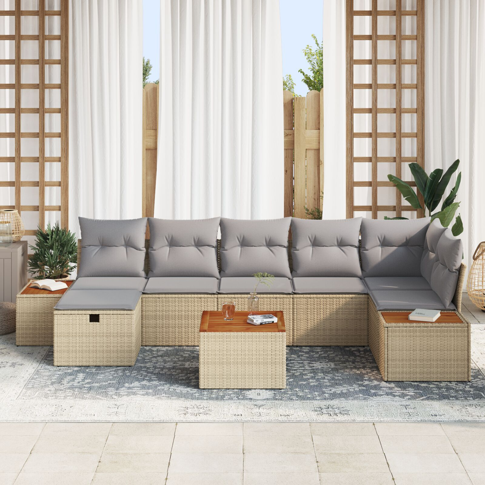 - Livrare conține: 3 x loc central inclusiv funcție de depozitare, 1 x loc de colț inclusiv funcție de depozitare, 2 x canapea inclusiv funcție de depozitare, 1 x taburet cu funcție de depozitare, 1 x masă de grădină