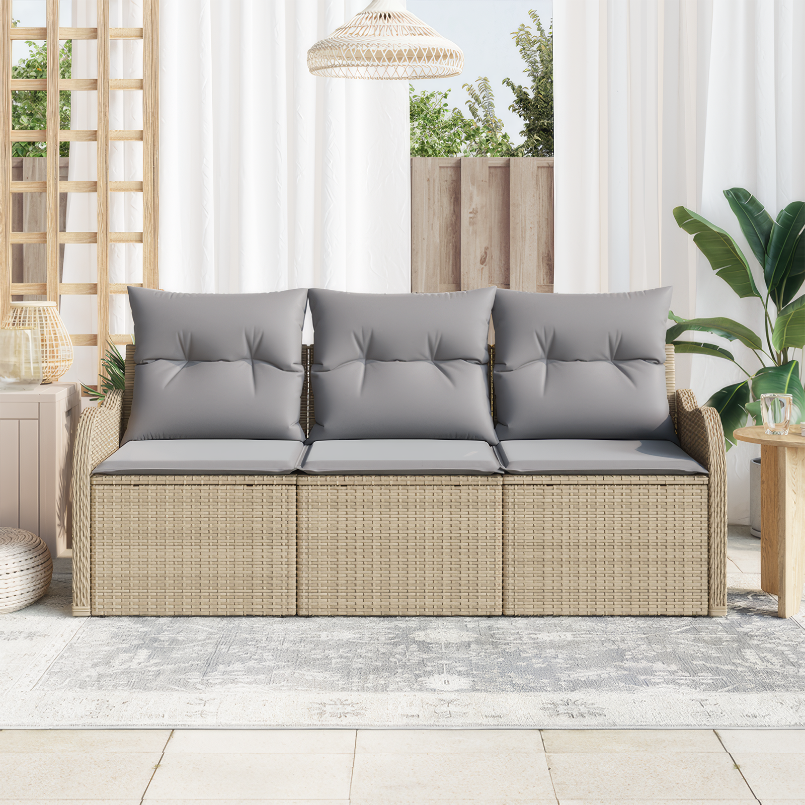 - Materiale Rezistente: Fabricată din ratan PE, canapeaua asta e ușor de întreținut și are un vibe natural. Cadru din oțel vopsit electrostatic înseamnă că rezistă la utilizarea zilnică în exterior fără să-și piardă stabilitatea.