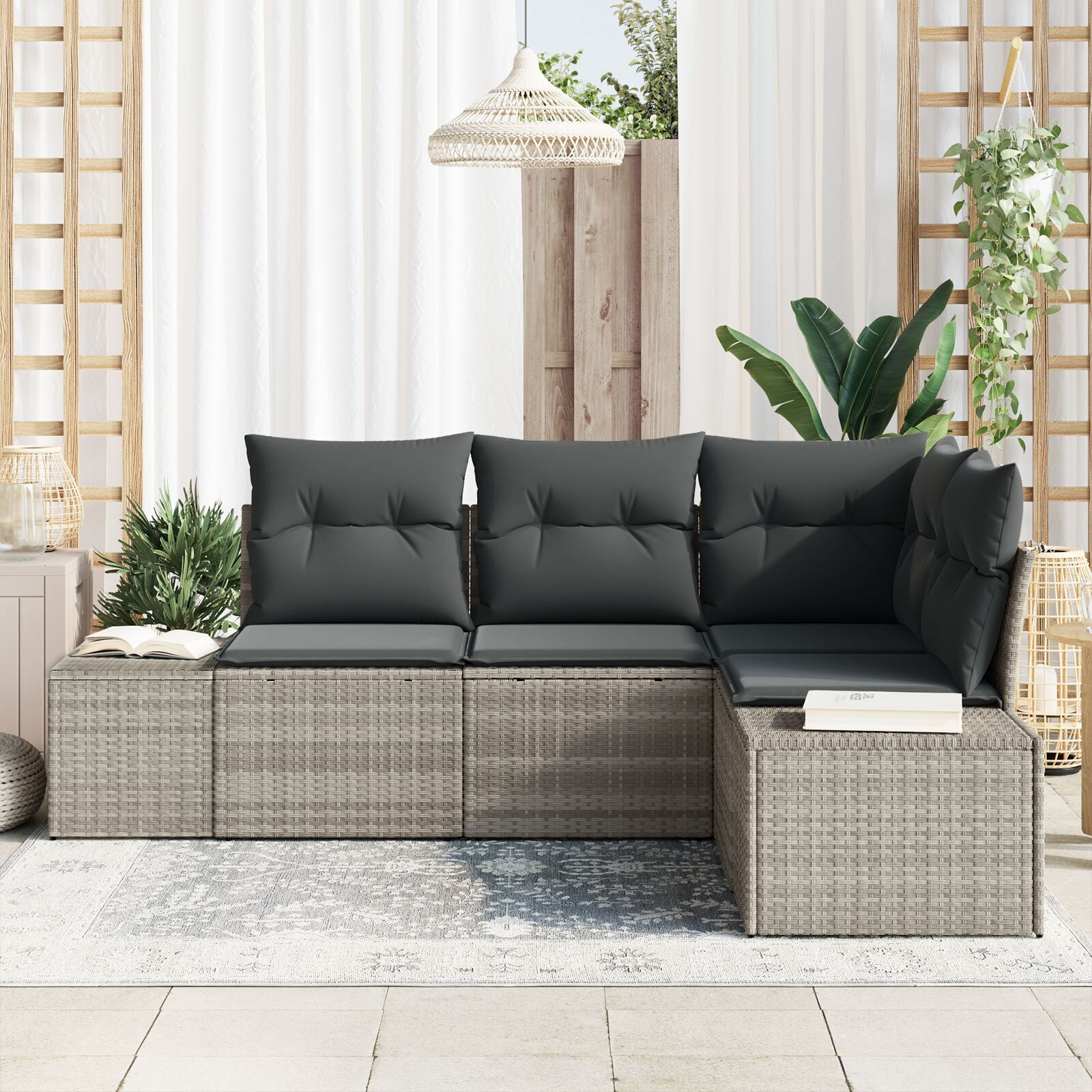 Această canapea secțională pentru exterior e o alegere genială pentru orice terasă, balcon sau grădină. E perfectă pentru momentele liniștite cu prietenii sau familia, cu nuanțe plăcute de gri deschis și gri închis. Canapeaua asta e super primitoare, perfectă pentru a te relaxa la soare sau pentru a te așeza cu o carte bună.