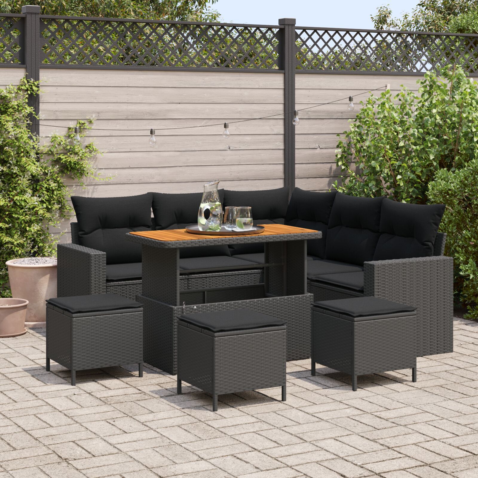 Set canapea de grădină cu perne Negru Ratan Poli Acacia 9 piese, Set dining grădină cu perne Negru Ratan Poli Acacia 4 piese GartenMobel Dekor