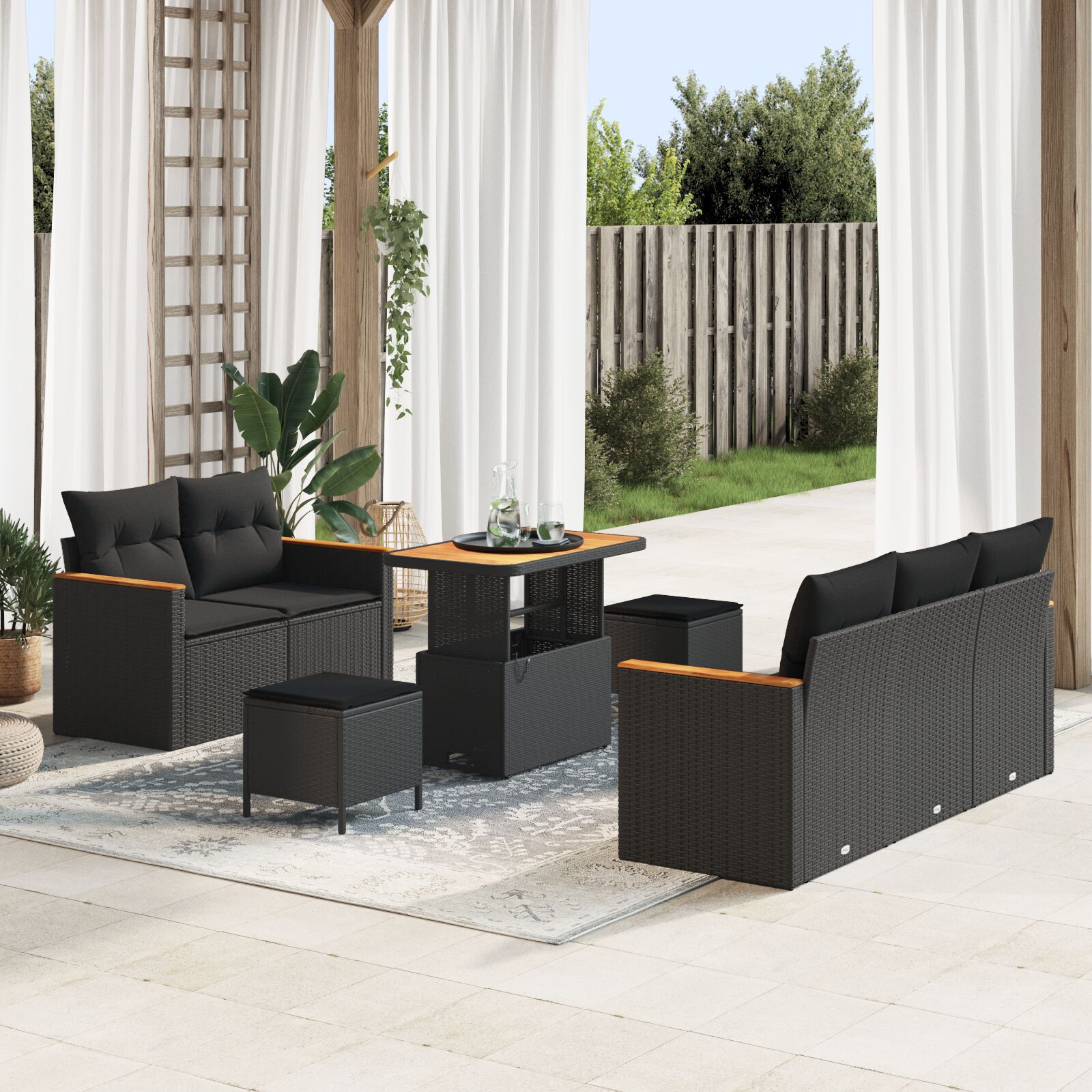Set canapea de grădină de 8 piese cu perne negru poliratan acacia, Set de dining de grădină de 3 piese cu perne negru poliratan acacia GartenMobel Dekor