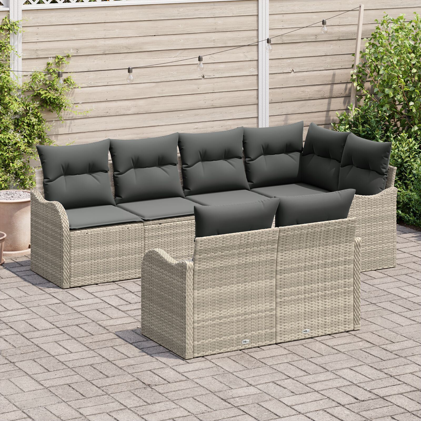 Set canapea de grădină gri deschis din ratan poliester cu 7 piese cu perne, Canapea de grădină cu 2 locuri și perne, gri deschis din ratan poliester GartenMobel Dekor