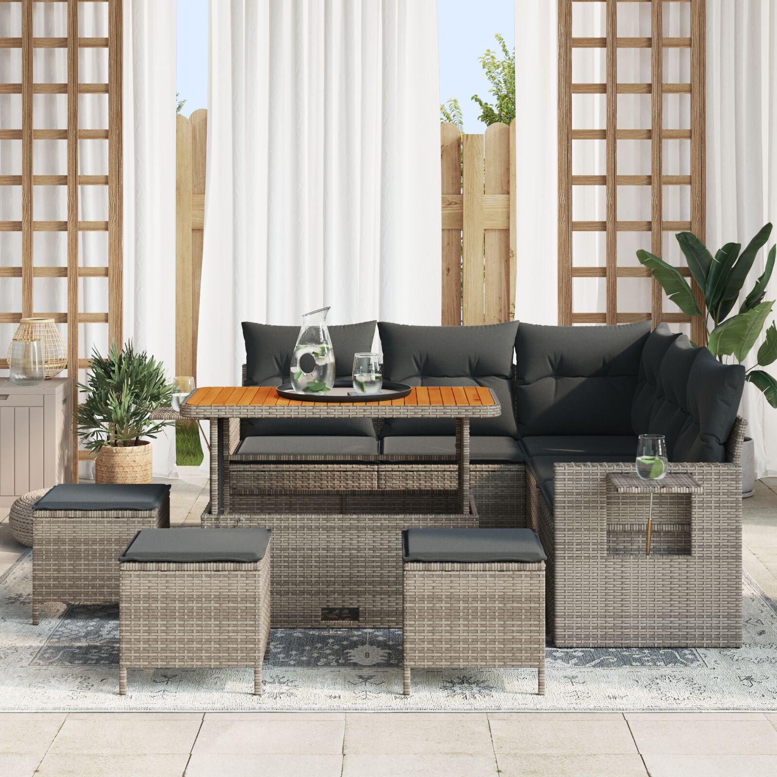 Set canapea de grădină în 8 piese cu perne gri Poli Ratan Acacia, Set de dining de grădină în 3 piese cu perne gri Poli Ratan Acacia GartenMobel Dekor