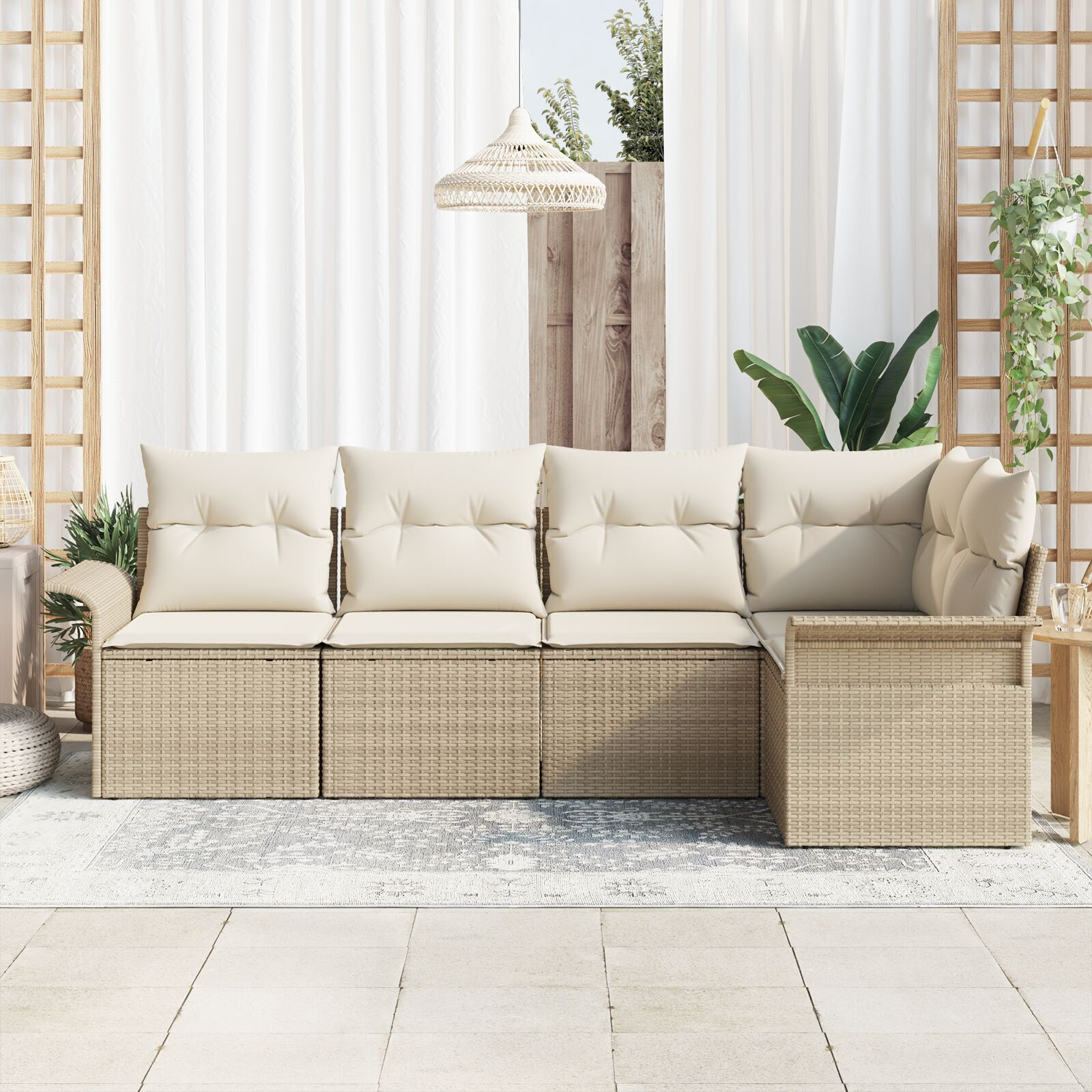 Setul ăsta de canapea secțională de exterior combină stilul cu practicitatea, perfect pentru relaxare pe terasa ta sau întâlniri cu prietenii. Cu un mix de culori bej și alb adorabil, arată grozav și e construit să dureze, așa că tu și oaspeții puteți să vă bucurați atât de confort cât și de un aspect plăcut.