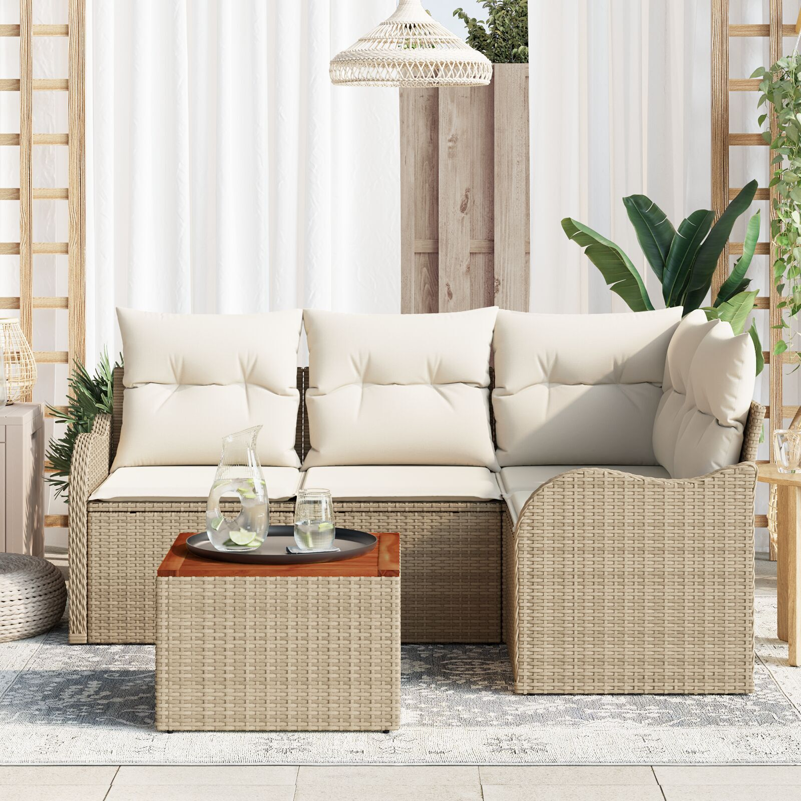 - Construcție Robustă: Ratan poli împletit manual și cadru din lemn de acacia, oferă stabilitate pentru toate întâlnirile tale în aer liber.