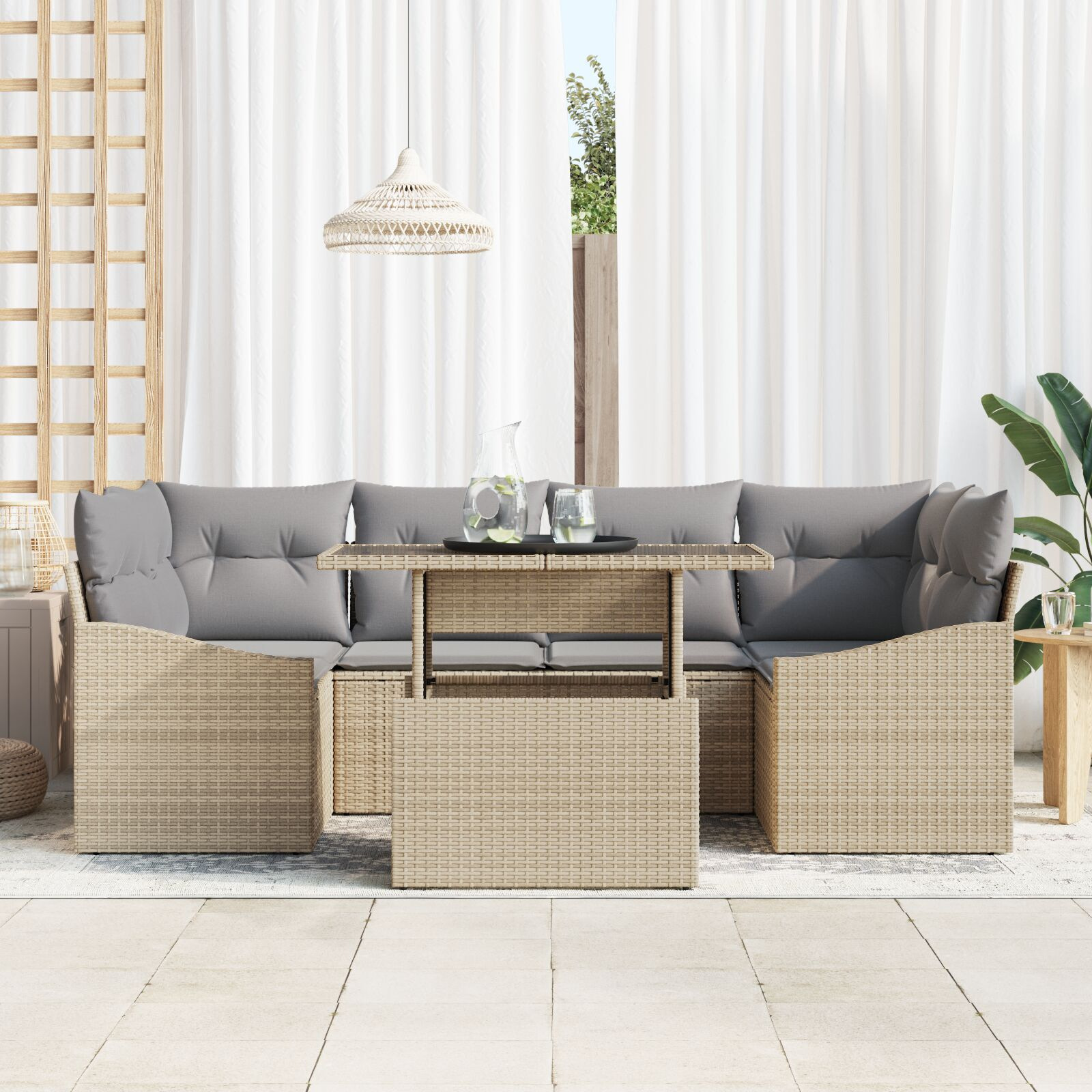 - Materiale Rezistente: Fabricat din ratan din polietilenă de calitate, rezistent la UV, acest set e făcut să reziste la vreme, asigurând utilizare lungă cu îngrijire minimă. Proprietățile impermeabile îți permit să te bucuri de spațiul exterior, indiferent de vreme.