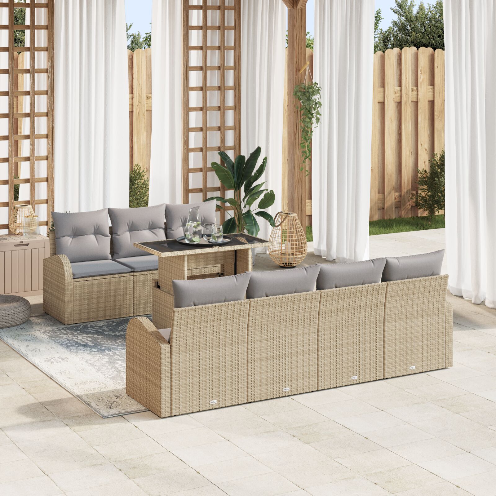 Setul acesta de canapea pentru grădină e tot despre stil și utilitate, perfect pentru a-ți face locurile exterioare mai faine, cum ar fi terase, balcoane sau grădini. Cu opt piese în set, are un look modern și chic, care combină confortul cu o atmosferă plăcută, fiind grozav atât pentru relaxare, cât și pentru întâlniri sociale.