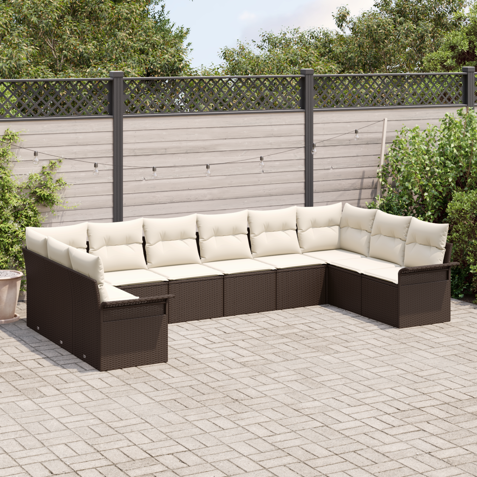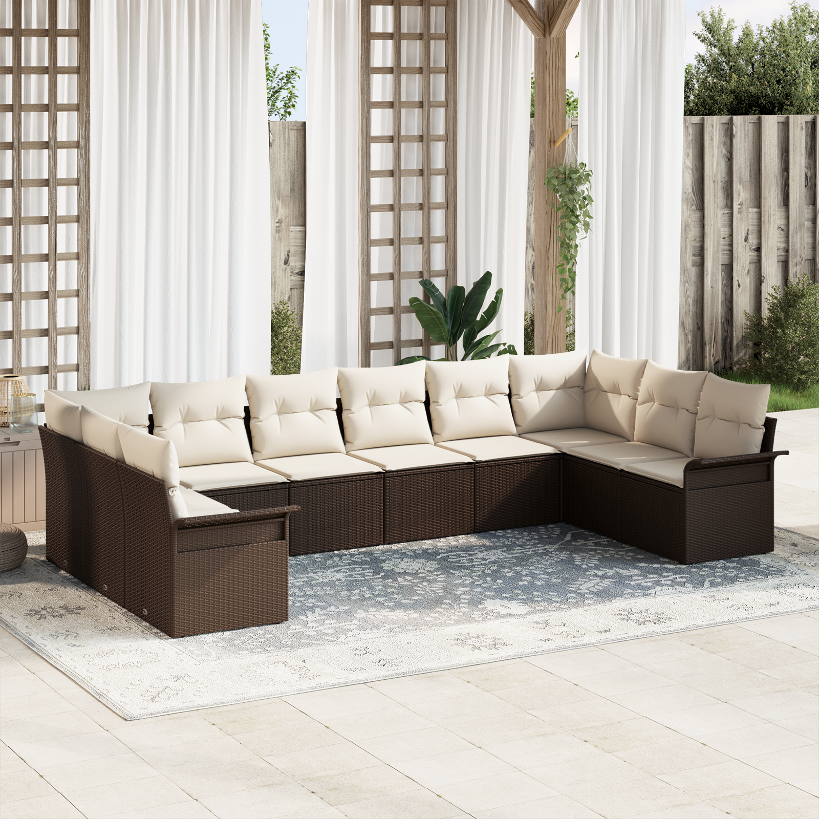 Setul acesta flexibil de canapele exterior aduce confort și stil grădinii sau balconului tău. Are un cadru din poliratan maroniu elegant cu perne crem care ies în evidență, făcând orice colț exterior să arate super. Fie că ai prieteni în vizită sau te relaxezi singur, aranjamentul ăsta e perfect pentru a te bucura.