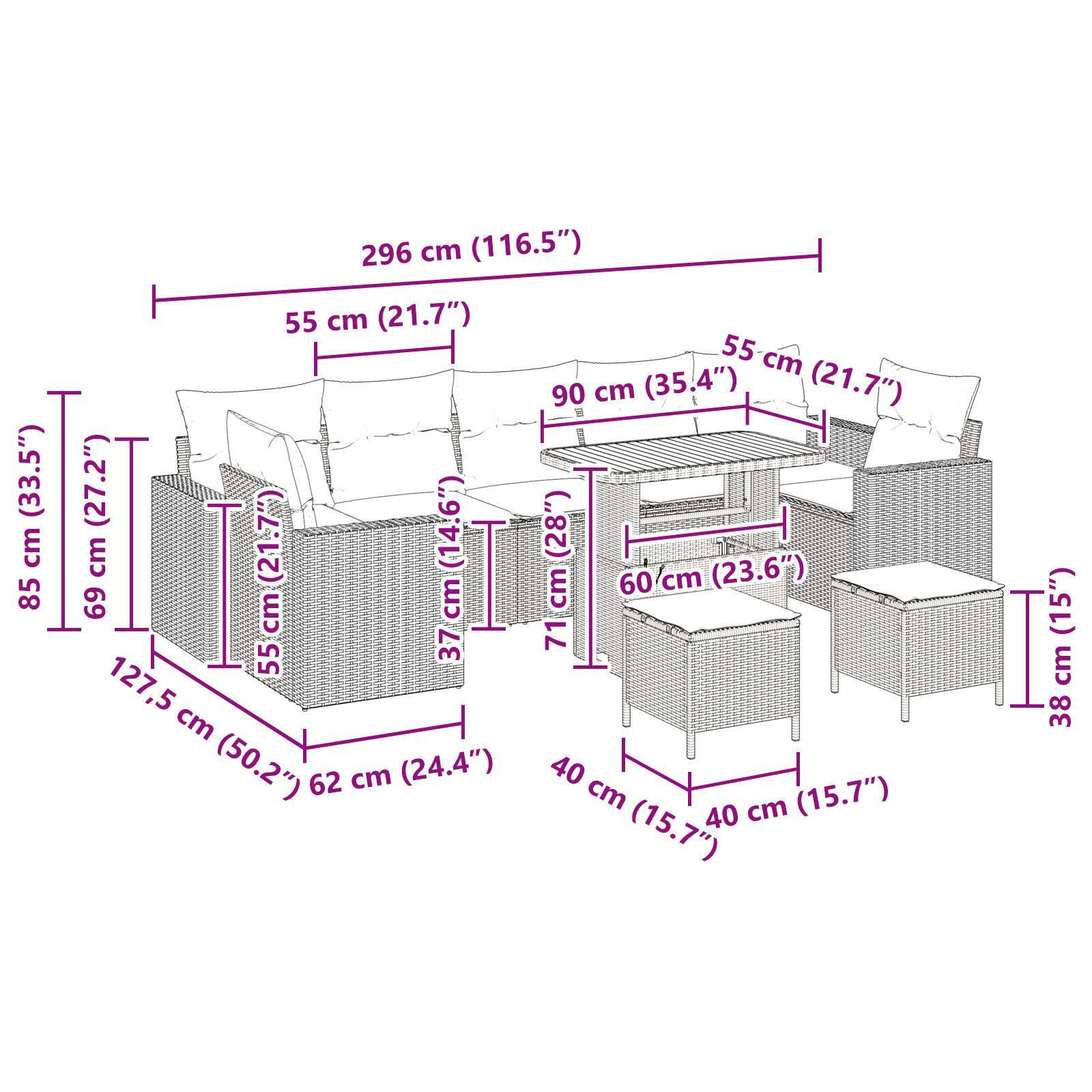 Set canapea grădină cu 10 piese și perne în poliratan gri și acacia, Set de dining grădină cu 3 piese și perne în poliratan gri și acacia GartenMobel Dekor