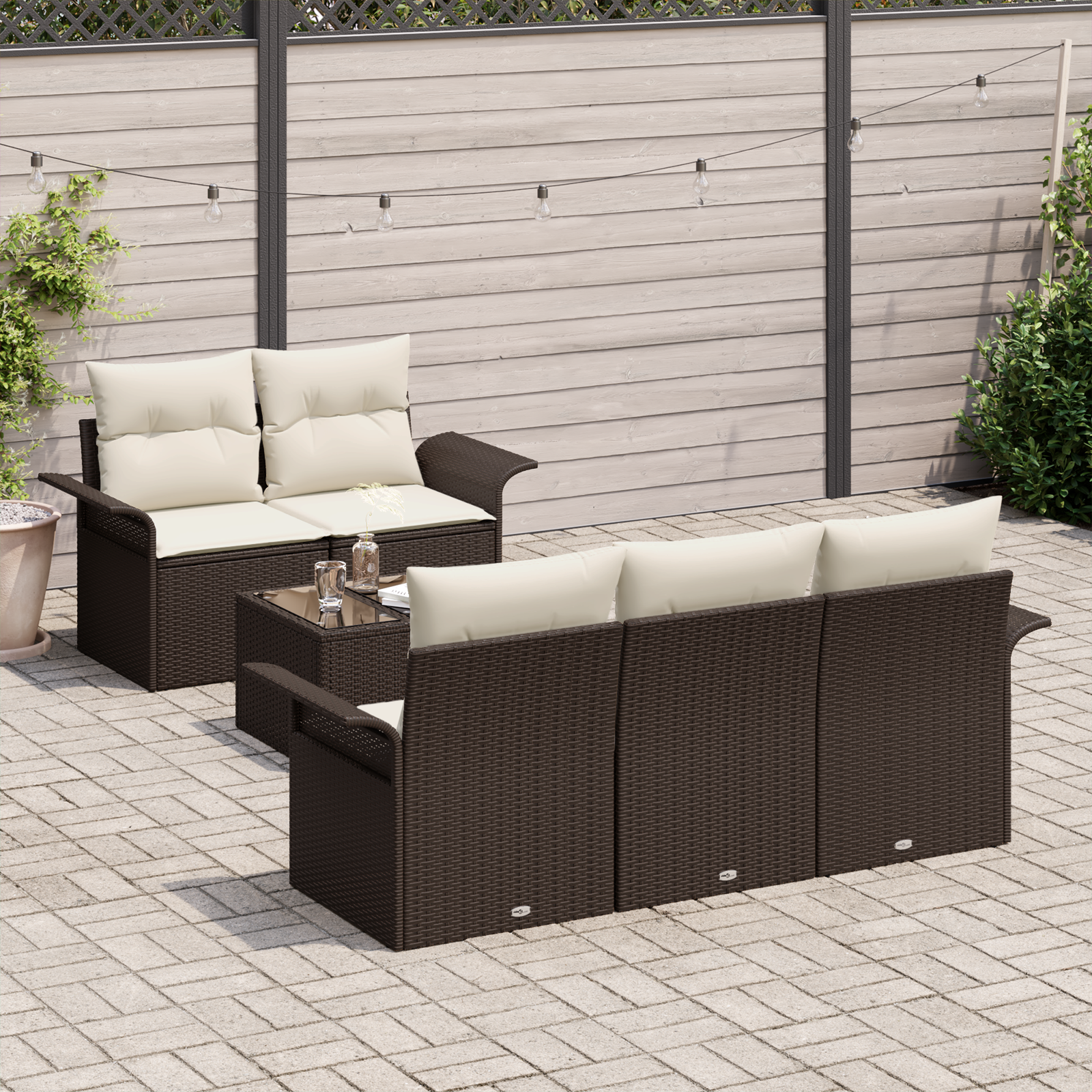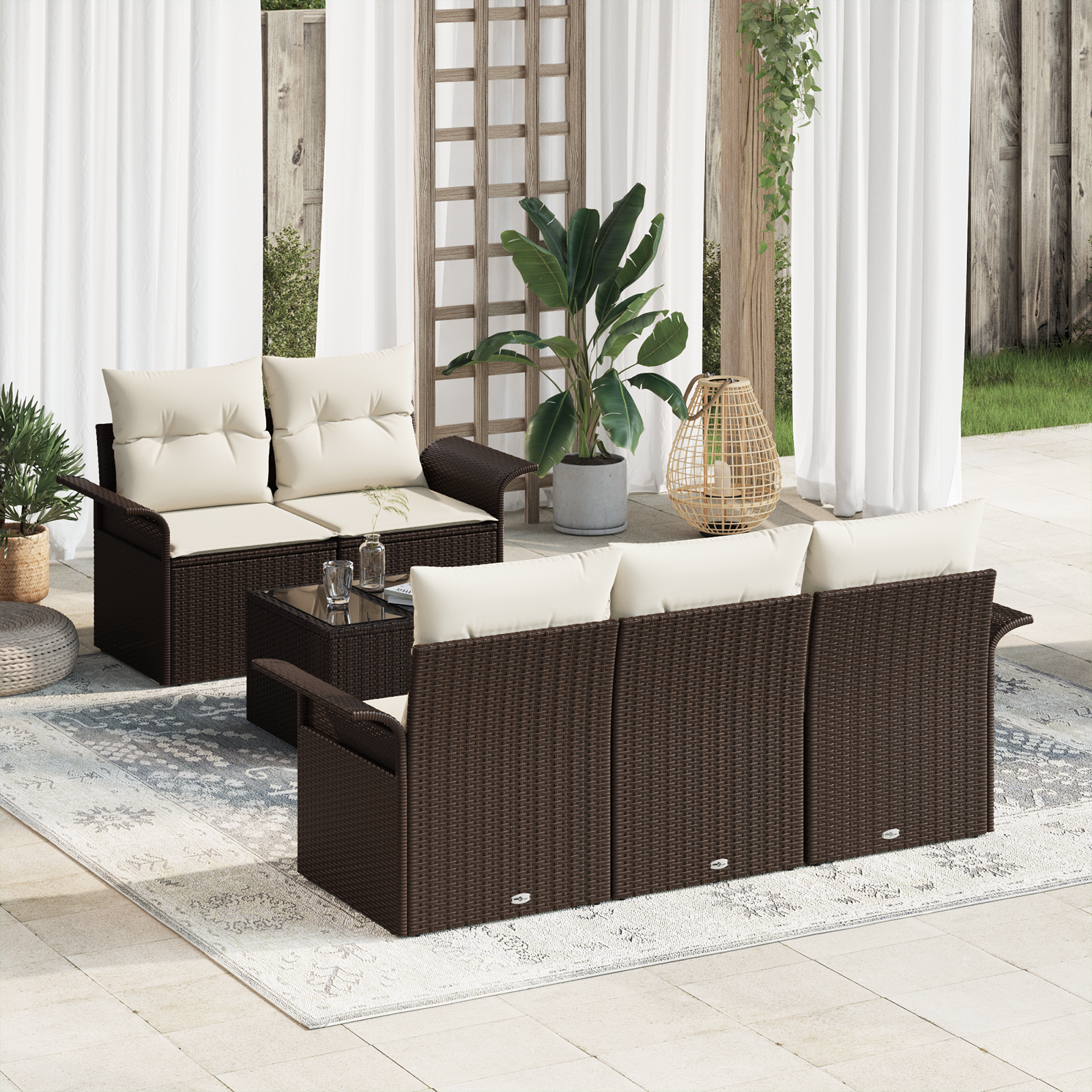 Setul ăsta de canapele grădină e tare chic și îmbunătățește orice spațiu exterior într-un refugiu super fain. Fabricat din ratan rezistent, are șase piese care combină utilitatea cu stilul - perfect pentru patio, grădini sau balcoane.