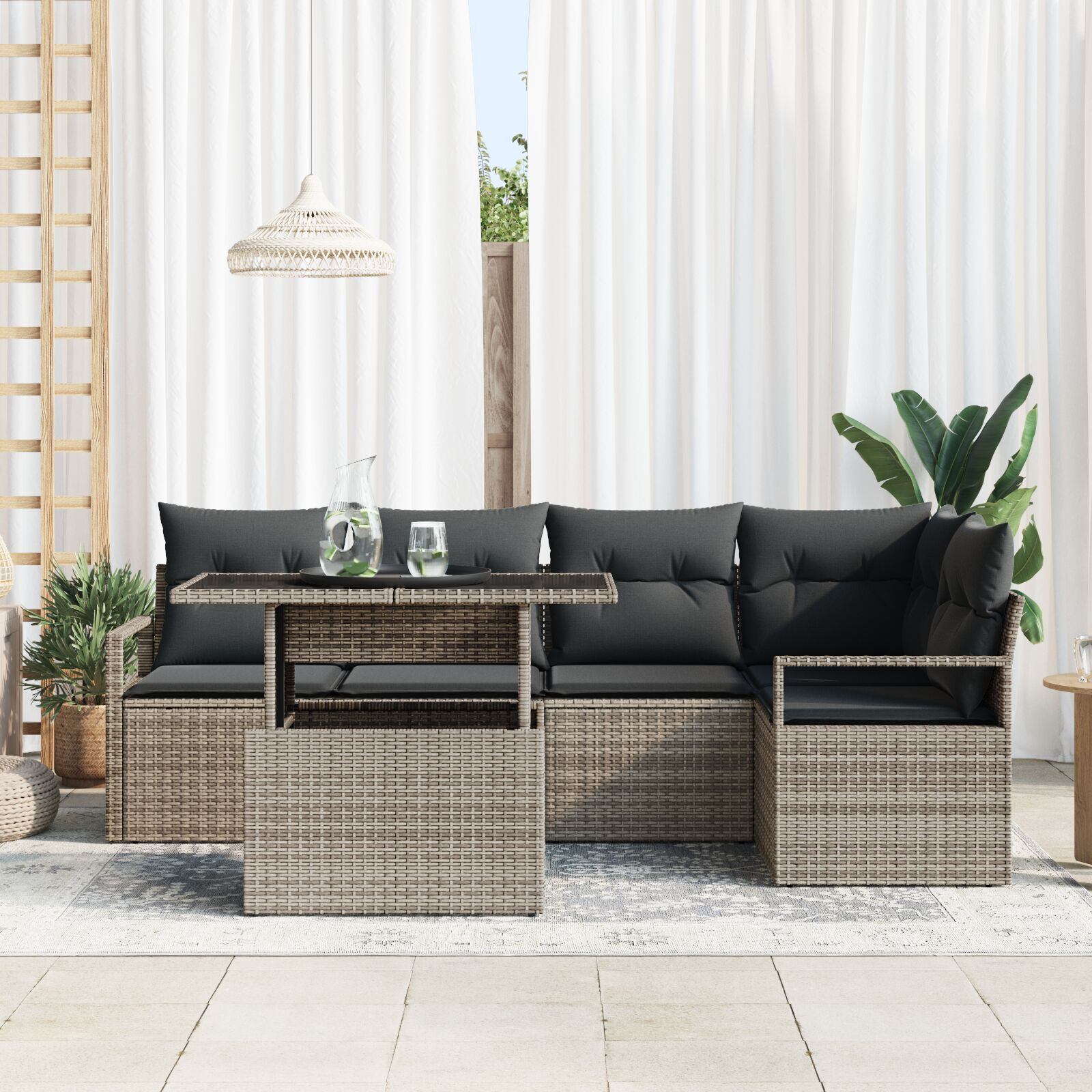 Acest set de canapele gri pentru grădină aduce un vibe elegant în orice zonă exterioară, conceput pentru a-ți îmbunătăți spațiul de viață cu un aspect modern. Designul modular îți permite să schimbi cum arată locurile pentru a se potrivi cu spațiul tău, ideal pentru balcoane înguste sau terase mari.