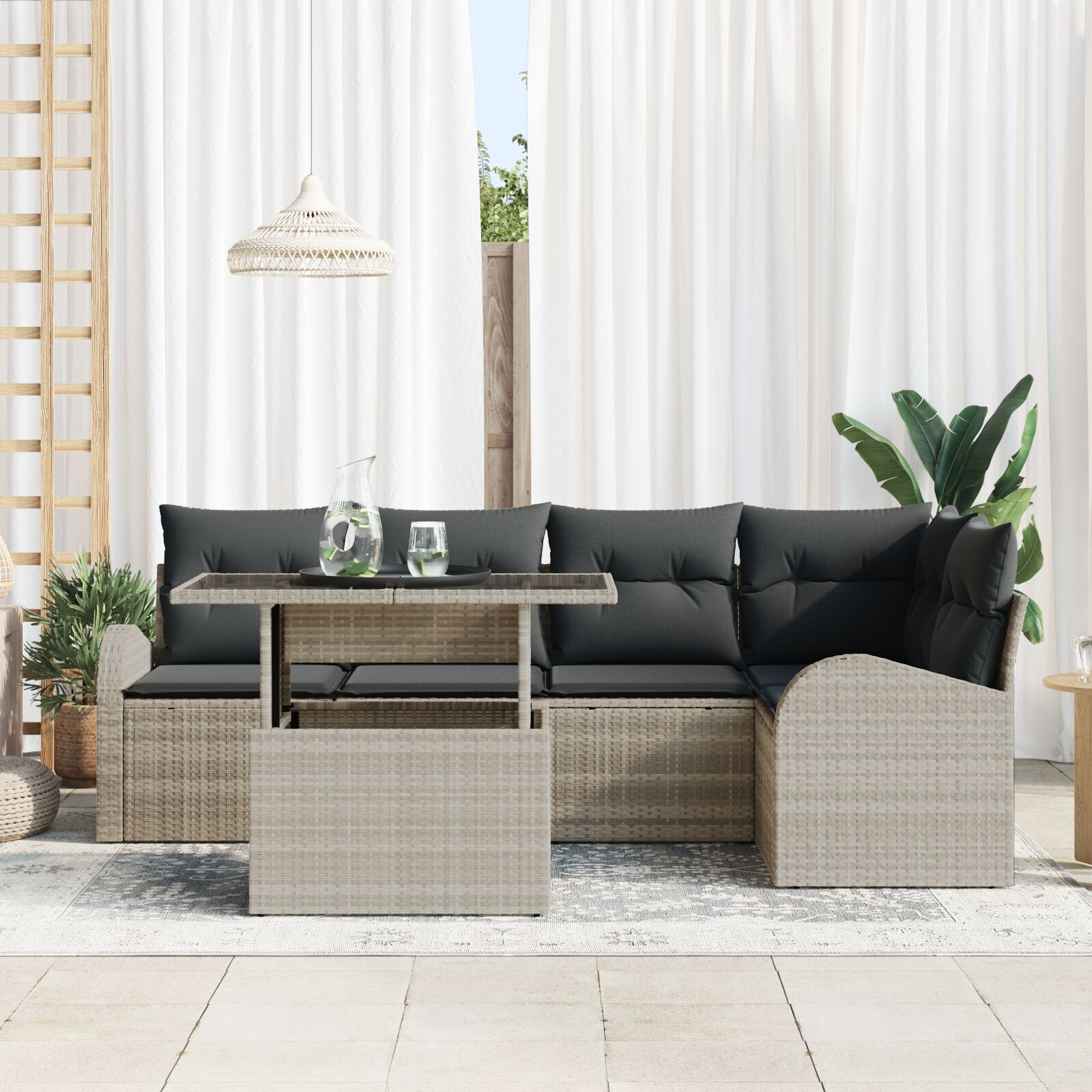 Setul ăsta de canapele pentru grădină îți oferă un setup chic și practic pentru locuri exterioare, cu mult loc pentru relaxare și socializare. Culorile gri deschis și gri închis, împreună cu designul din ratan împletit manual, creează o atmosferă confortabilă și elegantă, perfectă pentru terase, balcoane sau grădini.