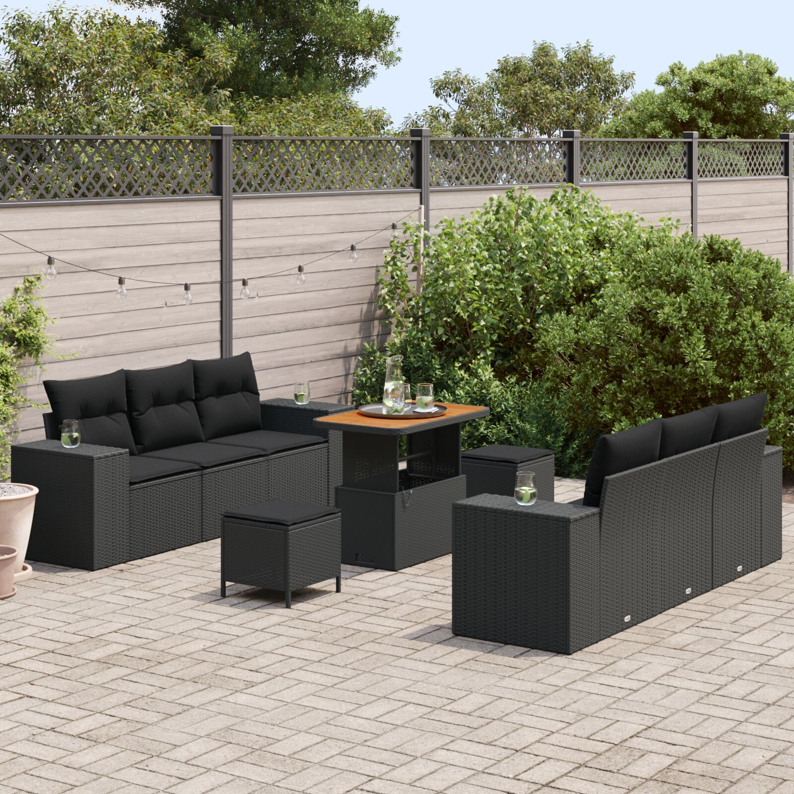 Set Canapea Grădină cu 9 Piese cu Pernițe Negru Poliratan Acacia, Set de Dining pentru Grădină cu 3 Piese cu Pernițe Negru Poliratan Acacia GartenMobel Dekor