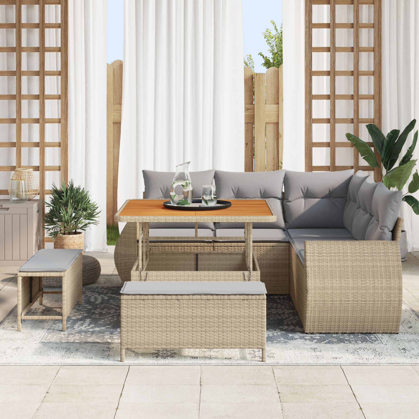 - Aspect elegant: Cu designul său modern, setul de canapea se potrivește perfect cu diverse decorațiuni exterioare, oferind un plus de stil. Ratanul bej și pernele gri deschis îmbunătățesc estetic.