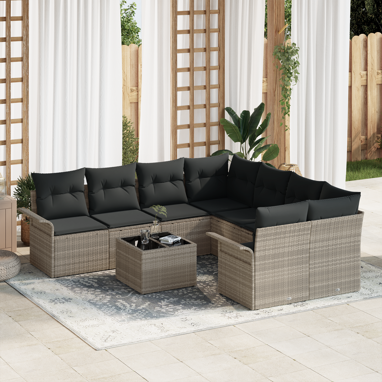 Acest set elegant de canapele pentru grădină se concentrează pe confort și stil, având un design modular trendy și practic. Fabricat din ratan poli rezistent și perne comfortabile, acest set exterior poate transforma orice balcon sau grădină într-un loc de relaxare, perfect pentru mese sau întâlniri cu prietenii și familia.