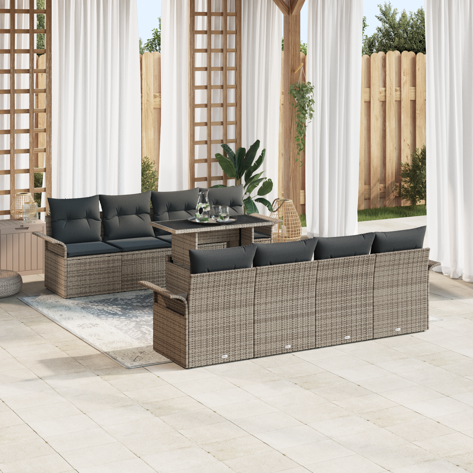 Setul de Canapea Grădină cu 9 Piese e o alegere genială pentru întâlnirile tale afară, combinând confortul cu stilul pentru toate nevoile tale de relaxare. Are un design modern cu ratan poli gri și perne gri comfortabile, perfect pentru întâlniri mici sau petreceri mai mari.