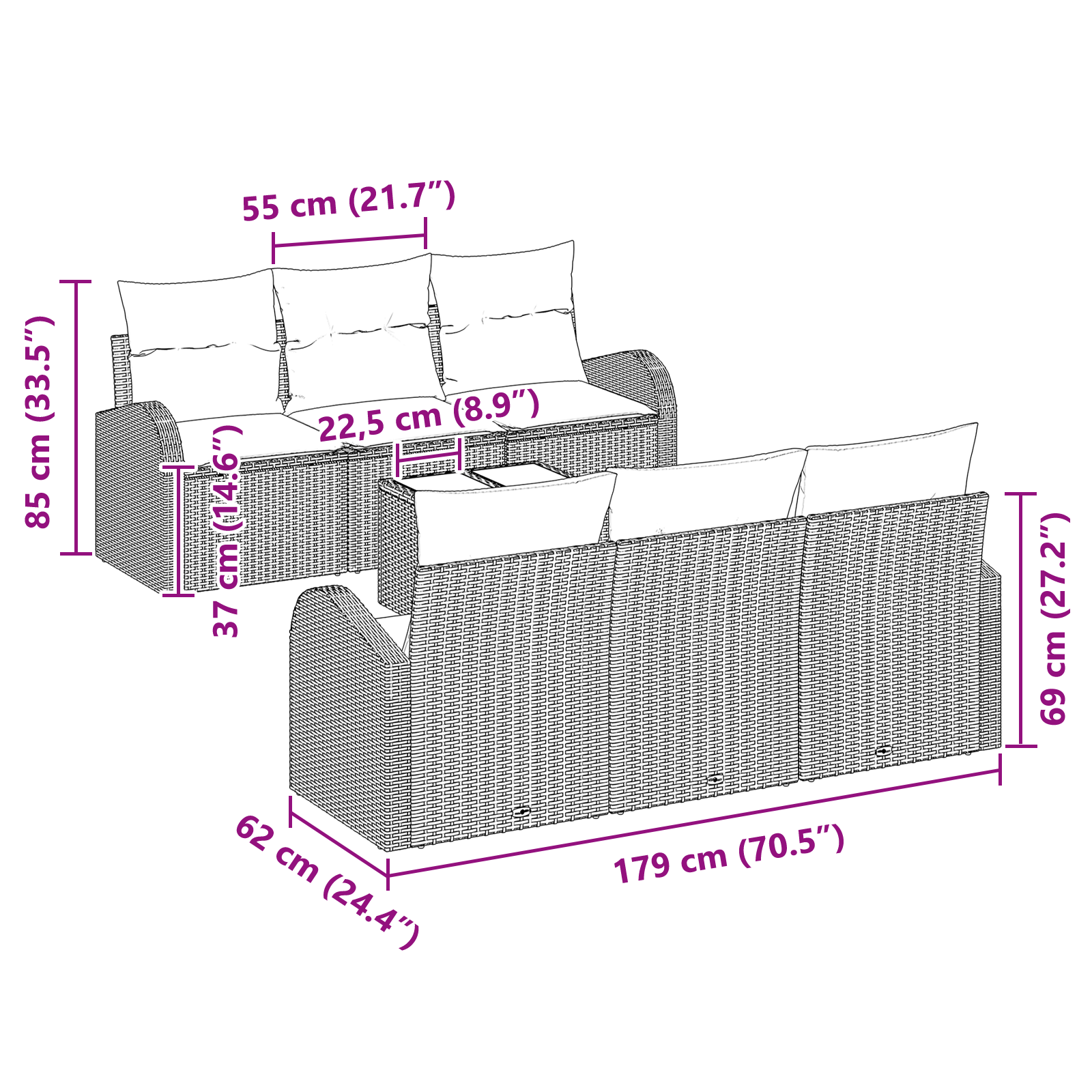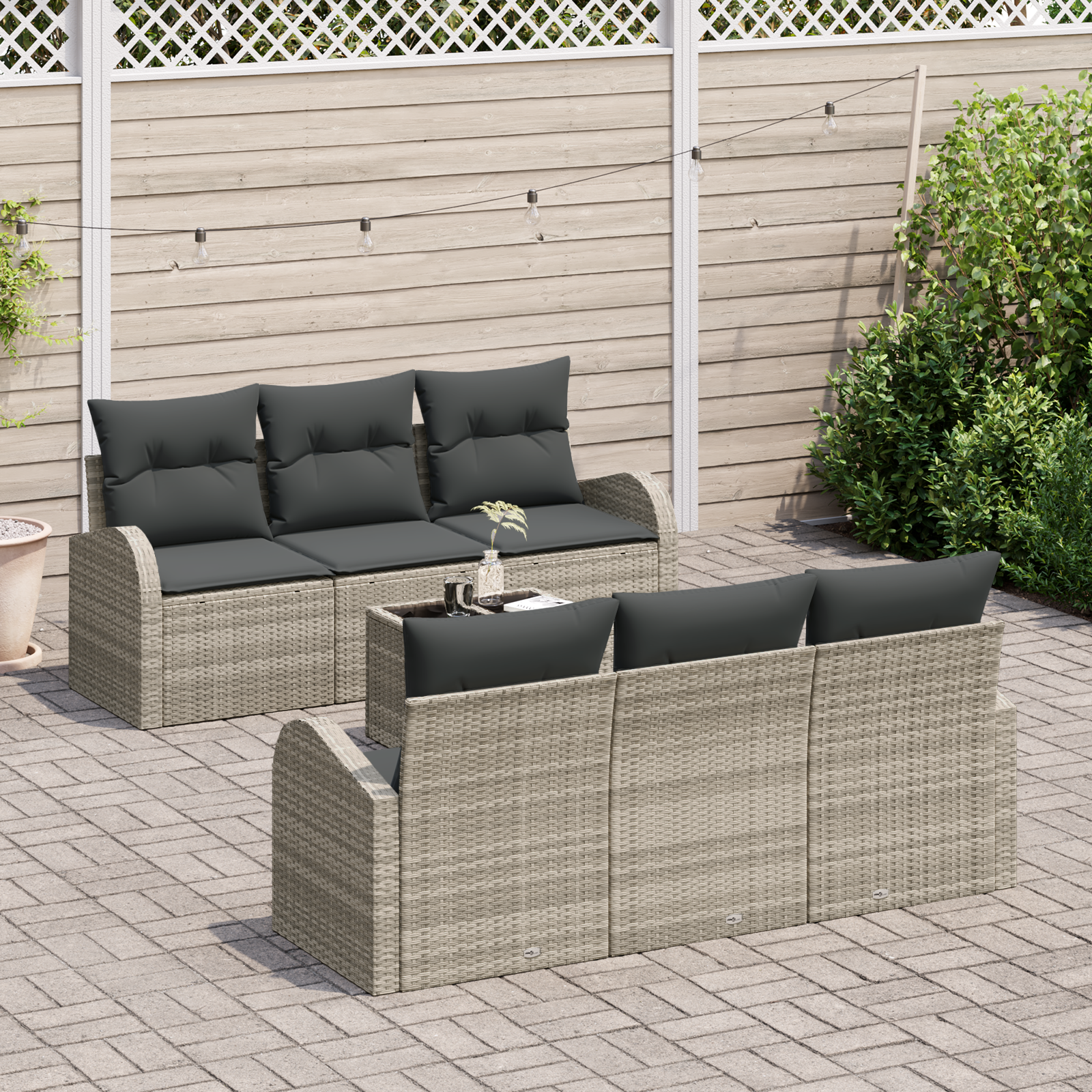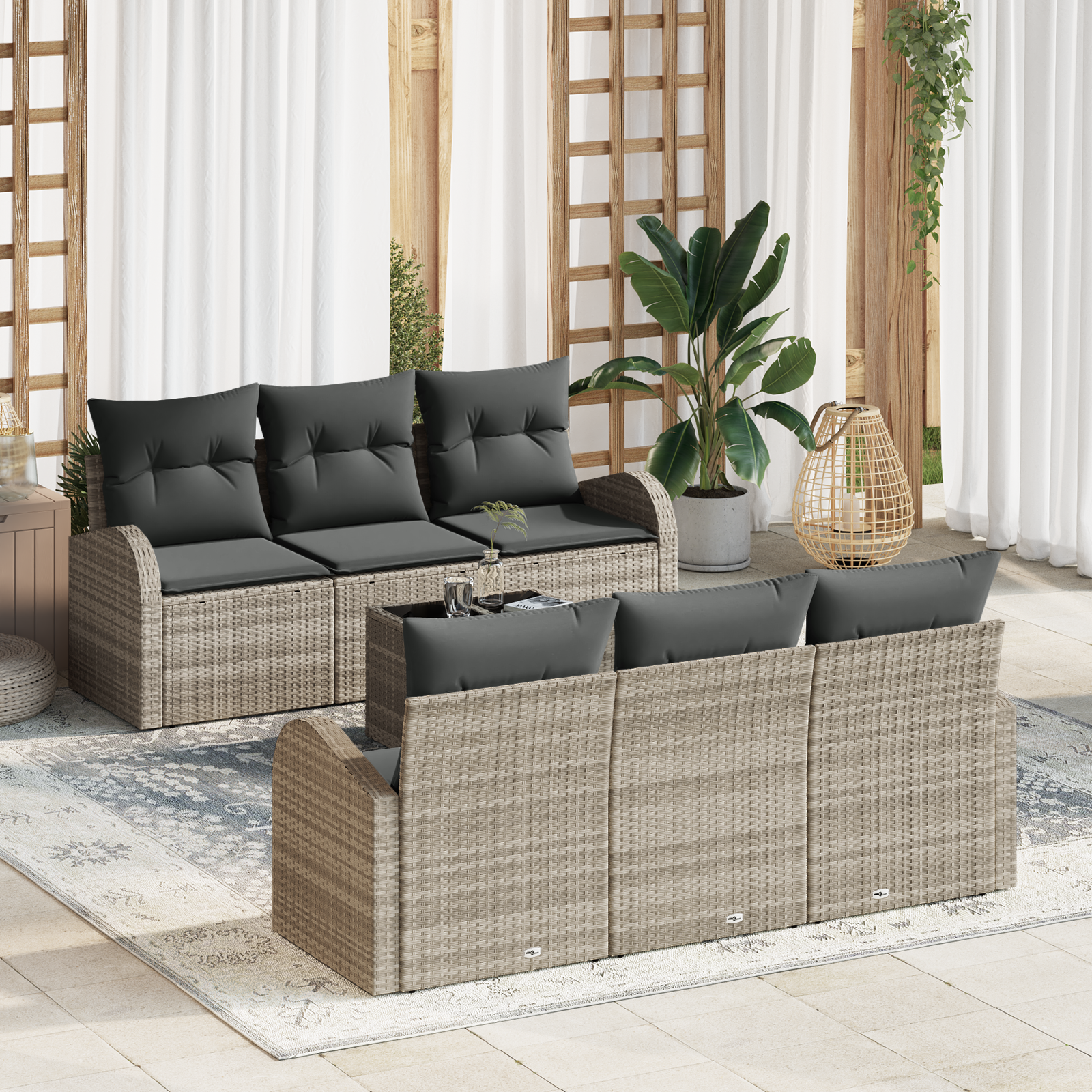 Setul ăsta de canapea grădină cu 7 piese combină eleganța cu utilitatea, aducând un plus de stil zonei tale exterioare. E făcut dintr-un cadru modern din poli ratan gri deschis și pernute confortabile care arată bine și păstrează confortul pentru toți.