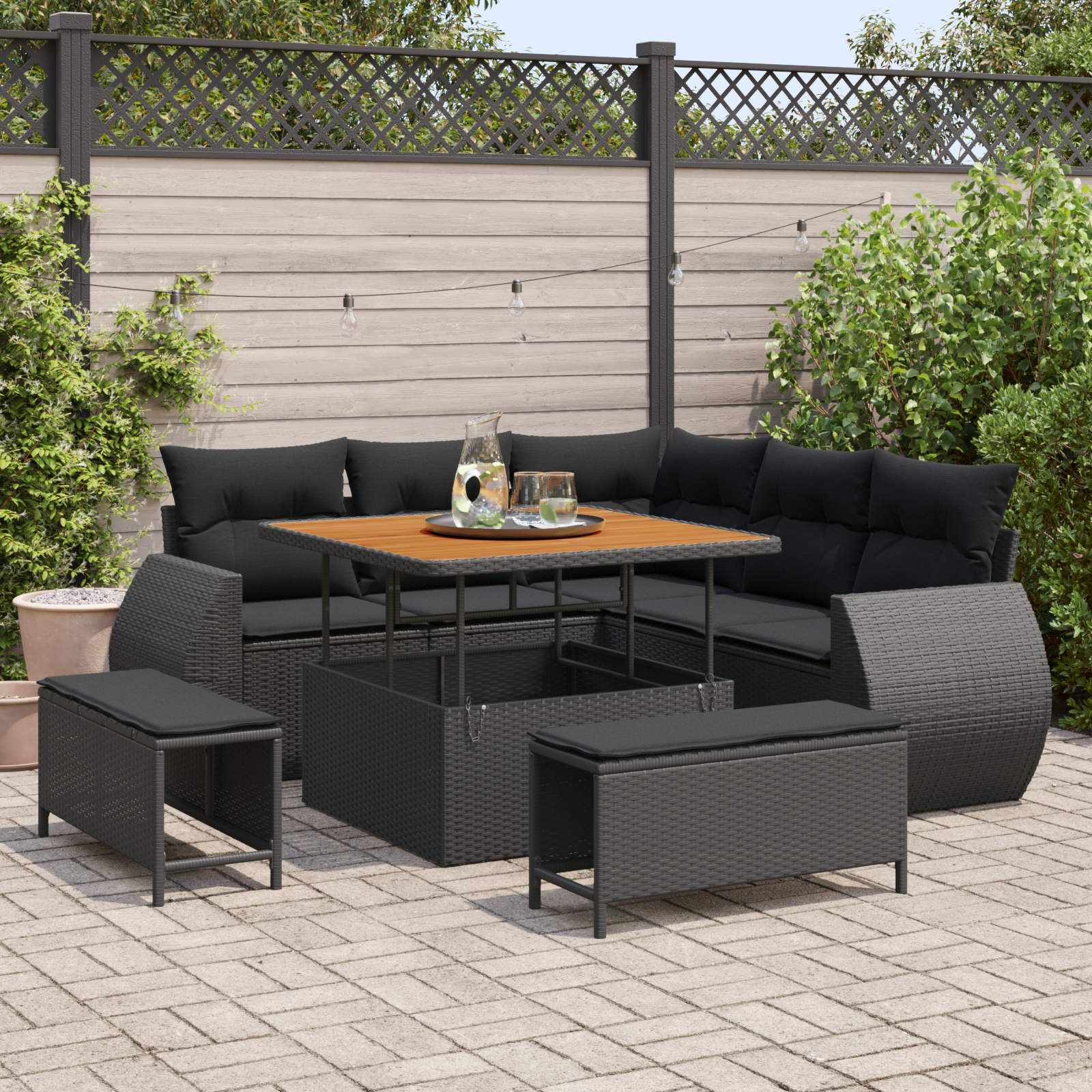 - Atractivitate Stylish: Cu un aspect modern și linii netede, acest set de canapea se potrivește frumos cu diverse stiluri exterioare, îmbunătățind atmosfera zonei tale. Amestecul chic de poliratan negru și detalii din lemn natural va ridica aspectul oricărui spațiu.