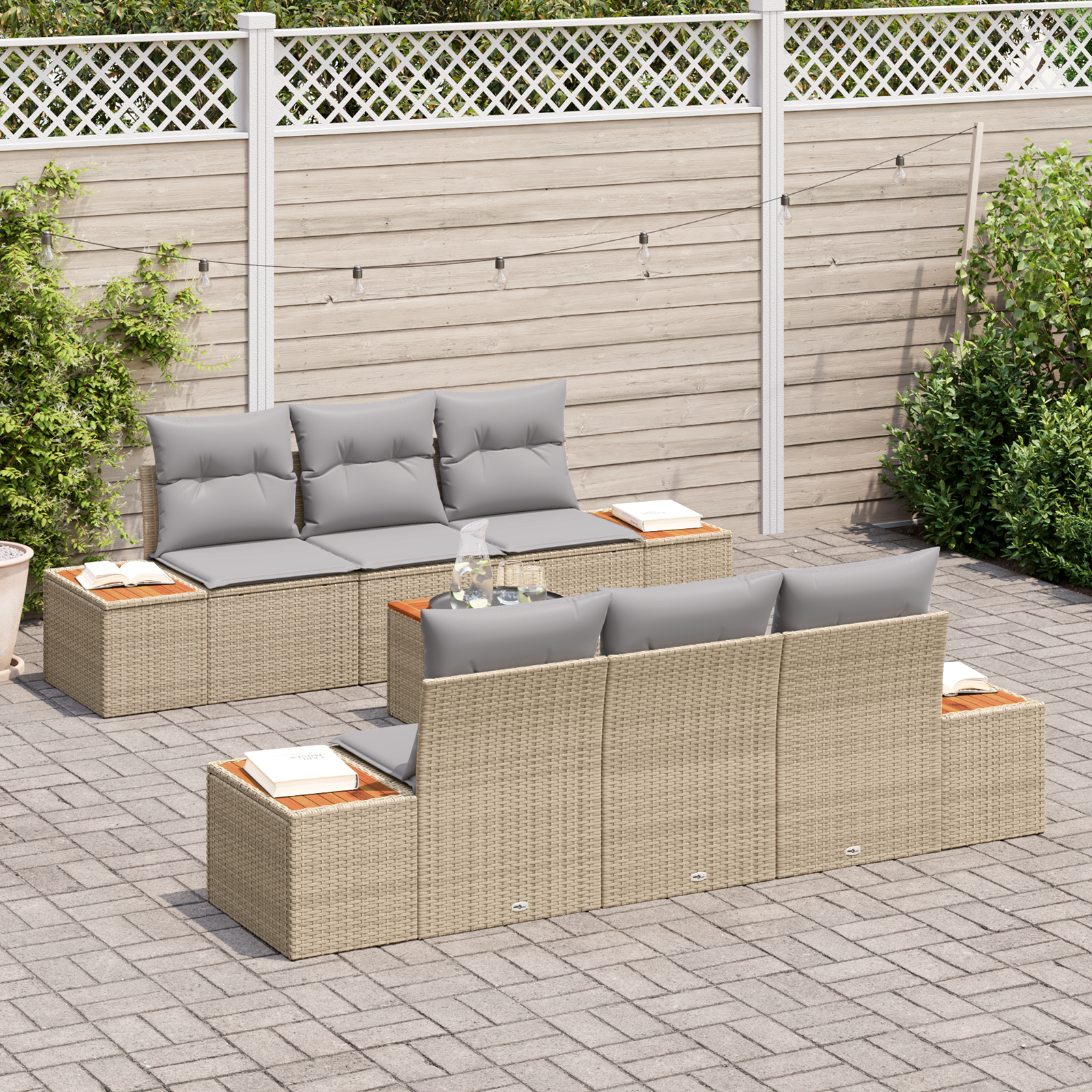 Acest set de canapea de grădină cu 7 piese are un vibe contemporan stylish care adaugă o notă de lux spațiilor exterioare. Fabricat din materiale de calitate, ratanul poliester țesut manual și lemnul solid de acacia creează un cadru robust, oferind în același timp un loc confortabil, perfect pentru petrecerea timpului cu familia și prietenii în grădină sau pe balcon.