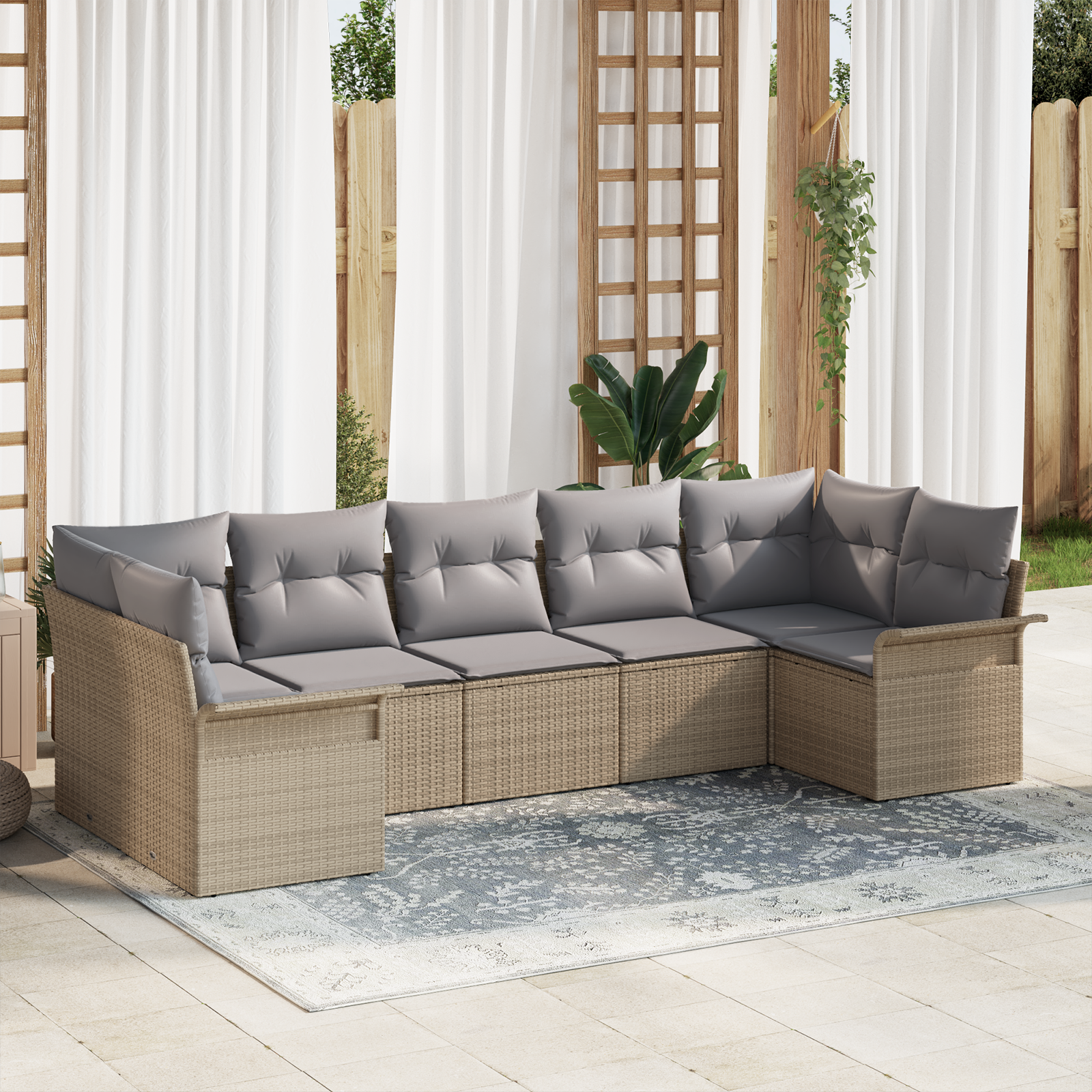 Acest set de canapele exterioare e perfect pentru a te relaxa în grădină sau patio. E făcut pentru a petrece timp de calitate cu prietenii și familia. Ratanul poliesteric bej se combină frumos cu pernele gri, formând un aranjament trendy și confortabil care arată fantastic în aer liber.