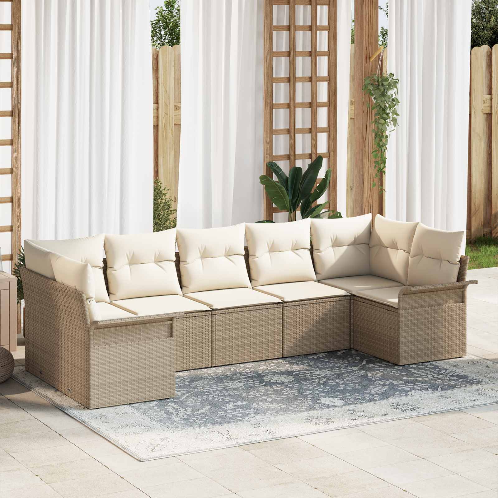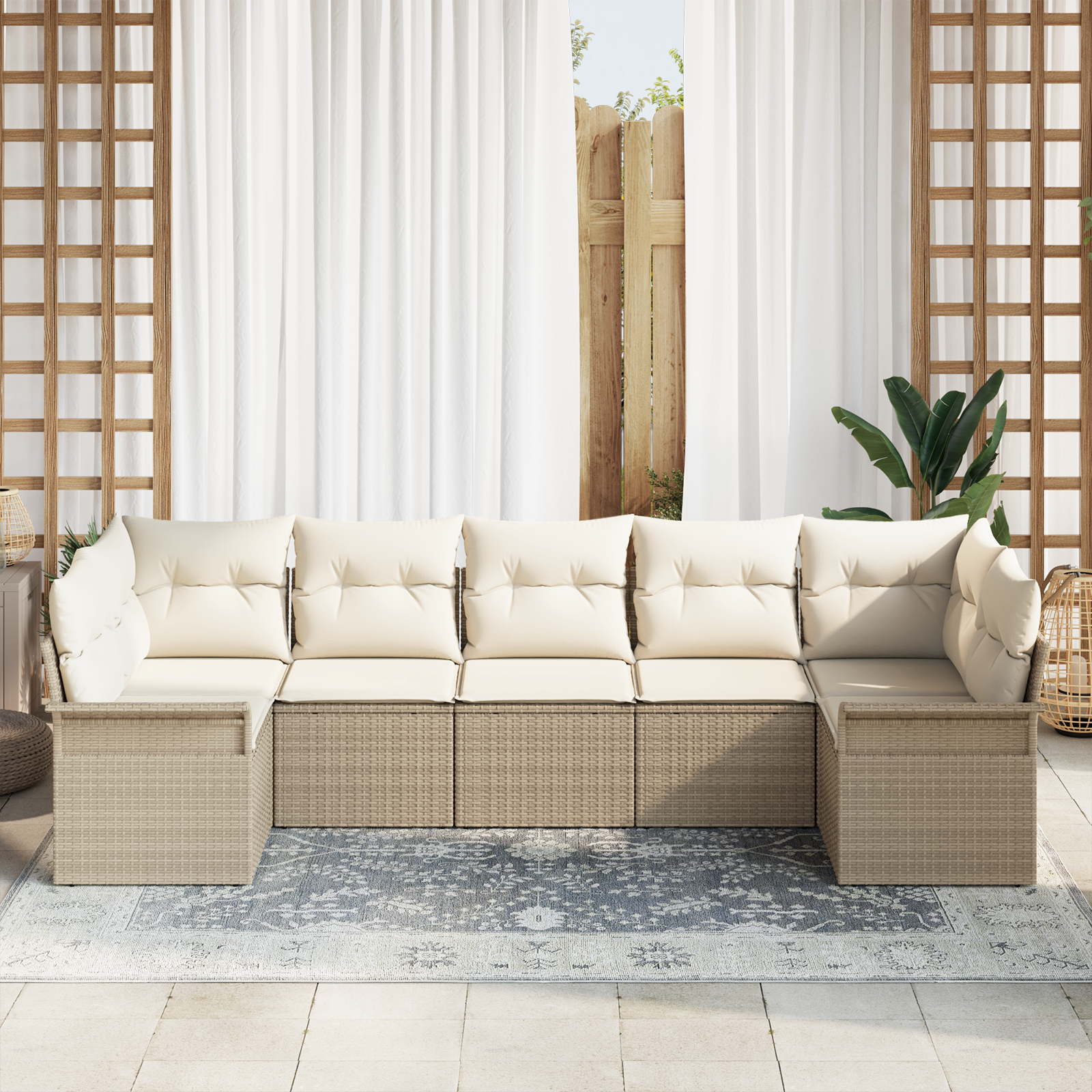 - Design flexbil: Această canapea secțională poate fi redistribuită pentru a se potrivi diferitelor spații exterioare, oferind flexibilitate în planul de șezut. Poți să o schimbi pentru a se potrivi aranjamentului de pe patio, după cum e nevoie.