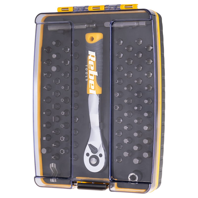 Cu setul de clichet 1/4 Rebel ai la indemana o selectie ampla de biti si tubulare pentru lucrari de insurubare, reparatii si mentenanta. Este ideal pentru casa, atelier sau trusa auto, iar cutia te ajuta sa pastrezi totul organizat si usor de transportat.
