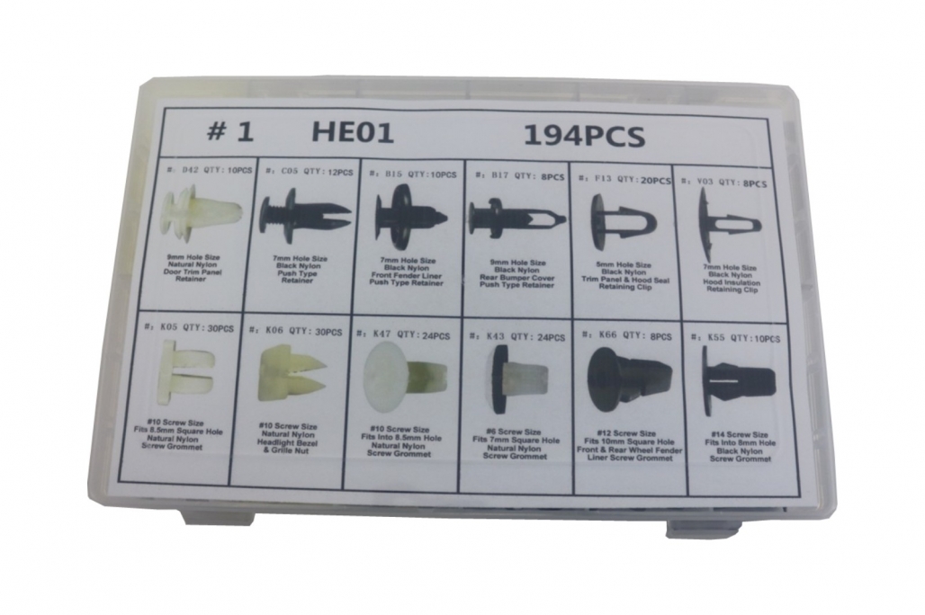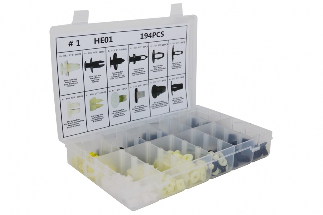 Set clipsuri auto universale cu 194 piese din plastic, potrivit pentru carenaje, bari, capitonaj, cheder, grile si panouri de usa. Ideal pentru inlocuirea rapida a clipsurilor uzate, setul vine intr-o cutie compartimentata, usor de organizat si folosit in garaj sau atelier.
