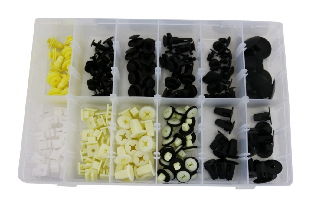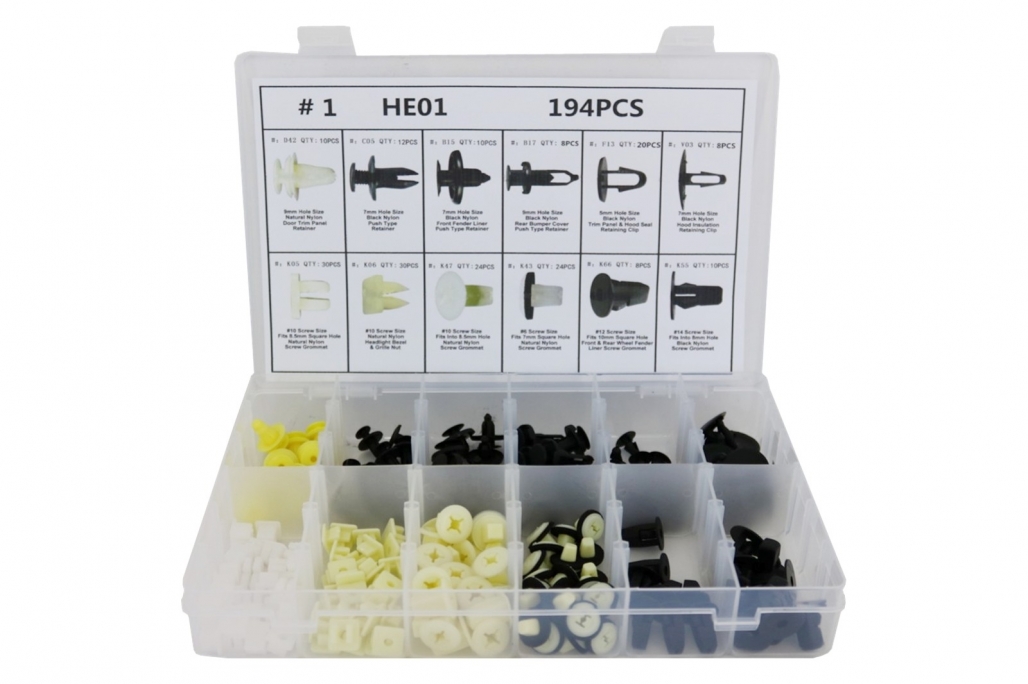 • include mai multe tipuri de clipsuri și nituri din plastic