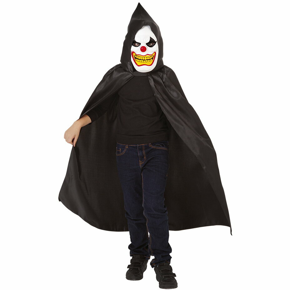 - Pelerina este prevazuta cu o gluga larga, care poate fi purtata pe cap pentru a spori efectul misterios si pentru a crea un look complet de clovn enigmatic
