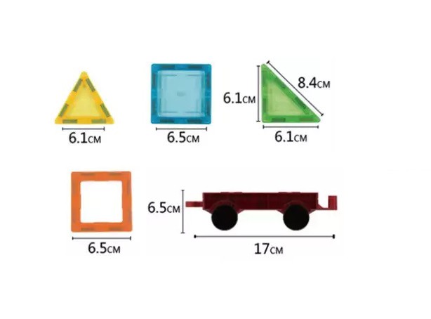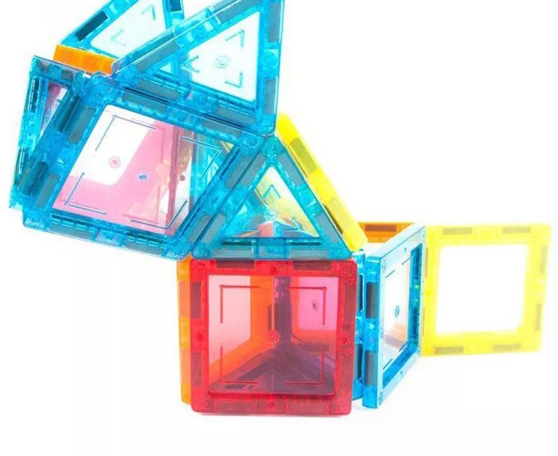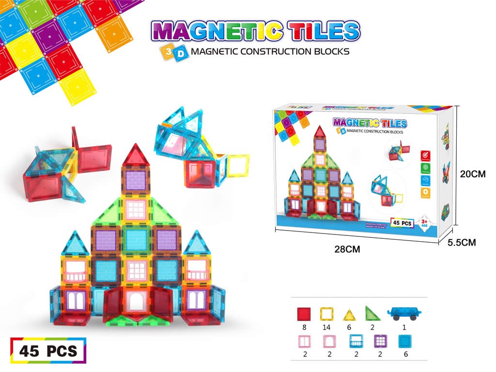 Setul contine 45 de piese magnetice multicolor din plastic transparent care ajuta copiii sa construiasca diverse forme geometrice unice de fiecare data.