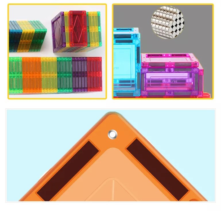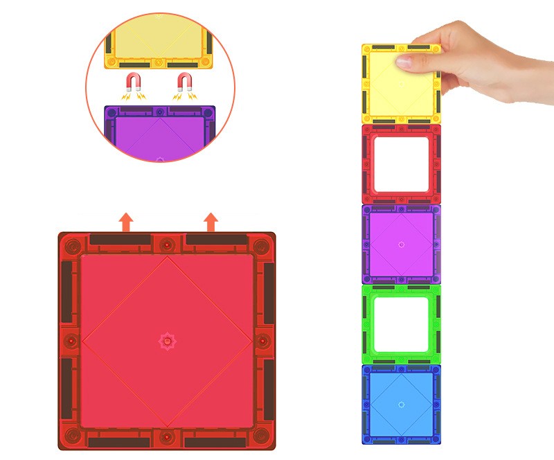 Piesele din set au marginile magnetice astfel incat sustin constructia diverselor forme si ajuta la stimularea creativitatii, imaginatiei, imbunatatirea atentiei si nivelului de concentrare.