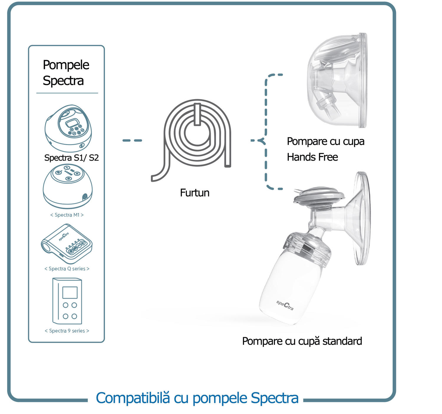 Atentie! Cupele Hands Free sunt compatibile cu pompele Spectra DUAL S, Spectra DUAL Compact, Spectra S1, S2, 9 plus, 9 S, M1 si Q fara a necesita accesorii suplimentare. Cupele Hands Free nu sunt compatibile cu pompa manula Spectra si cu cele tip piston (DEW300/DEW350). Cupele Hands Free sunt compatibile cu biberoanele Spectra cu gatul larg.